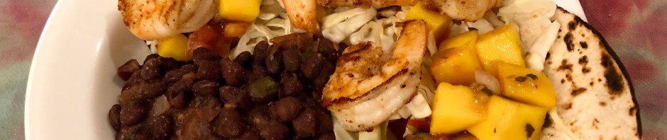John sauteed the shrimp in a little olive oil and spray and toasted the tortillas over the open flame of the stove. I added chopped up mango to some fresh salsa and cooked the beans with a can of Rotel original and added some cumin and chipotle powder for more zing. It probably took about 15 minutes to make this satisfying dinner.