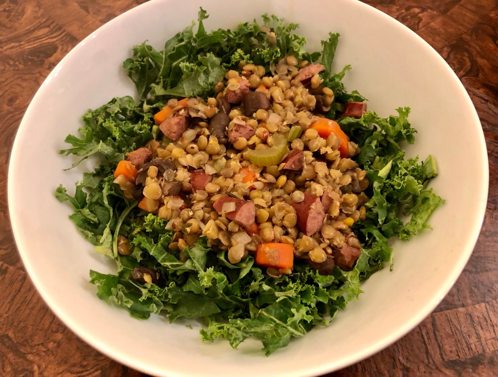 Basically I chopped all the components and put them in the large Le Creuset pot we call Potapotamus to cook with a couple of teaspoons of olive oil and some spray. Mushrooms first with a few pieces of turkey sausage for additional oil. Then, onions, carrots, celery, garlic, chicken stock, the rest of the turkey sausage, a couple of sprigs of thyme, and the lentils. Cook until the lentils are tender, around 20 minutes. The kale underneath is wilted by the heat from the stew. John uses a bit of finishing oil but I do not.