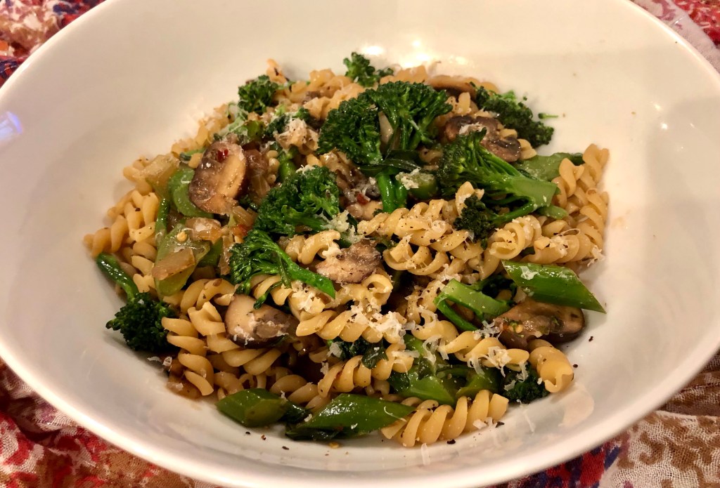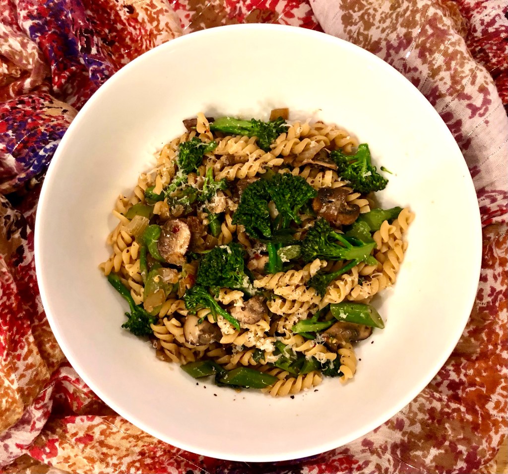Fusilli with broccolini and mushrooms is a vegan (without parmesan) or vegetarian delight. Using Carba Nada pasta means that the carbs and calories are lower which means that I can have more pasta with less guilt!