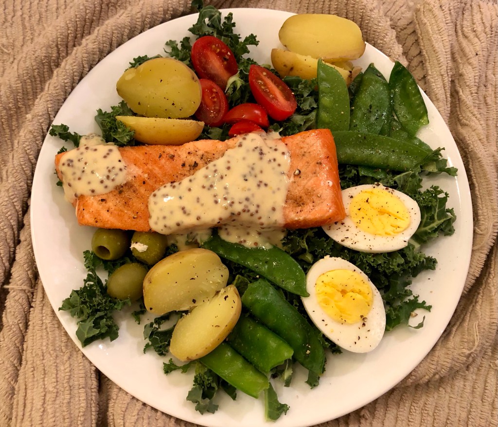 Kudos to John who cooked a perfect piece of salmon and kudos to me for making the rest of it. I used my new favorite, shredded kale from Trader Joe’s, as a base. With one small pot of boiling water I boiled the hard boiled eggs, followed by a quick blanch of the snow peas, and then a 15 minute cook on the new potatoes. I laid those artfully around the plate along with some cherry tomatoes and castelvetrano olives. John put on the salmon and I dressed the plate with mustard sauce that I make out of Skinny Girl buttermilk dressing and Dijon and whole grain mustards.