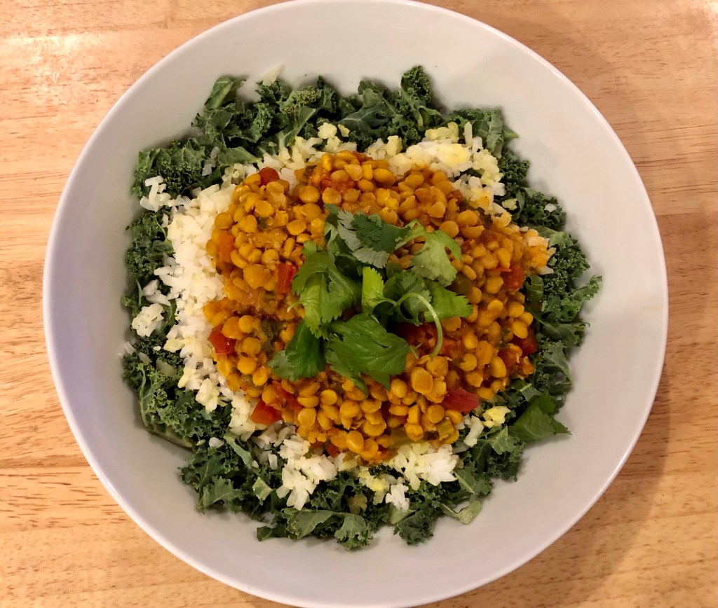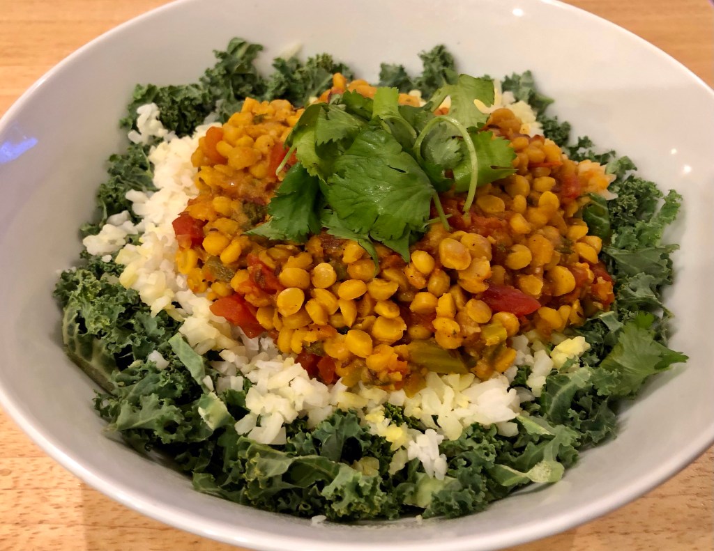 I served my heaping helping over raw kale and a cauliflower rice/white rice mix and sprinkled some cilantro on top. Delicious!