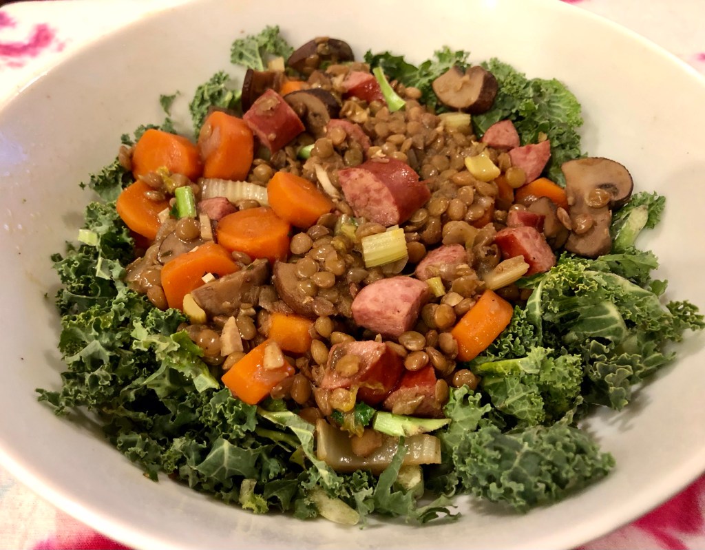 The lentils need about 20-30 minutes to become tender. I served it over raw kale but it would be good over rice or even just as is.