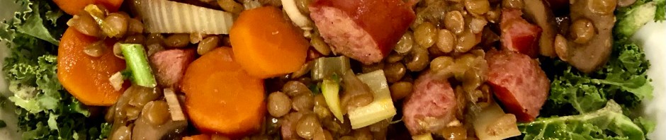 We used to make this dish as lentils, turkey sausage, and carrots but decided to up the vegetable ante to include celery, mushrooms, and kale to make it more nutritious and filling. I start my lentil stew by sautéing the turkey sausage in a little olive oil and then removing the slightly browned pieces and adding the mushrooms, onions, and garlic to the oil which is now flavored by the sausage. Once they are cooked I add the lentils and the rest of the vegetables with chicken stock to cover. Towards the end of cooking I add the turkey sausage back in. Along with salt I used chipotle powder, smoked paprika, and sriracha to season and spice things up. I was aiming for a spicy, smoky outcome.