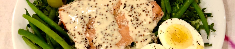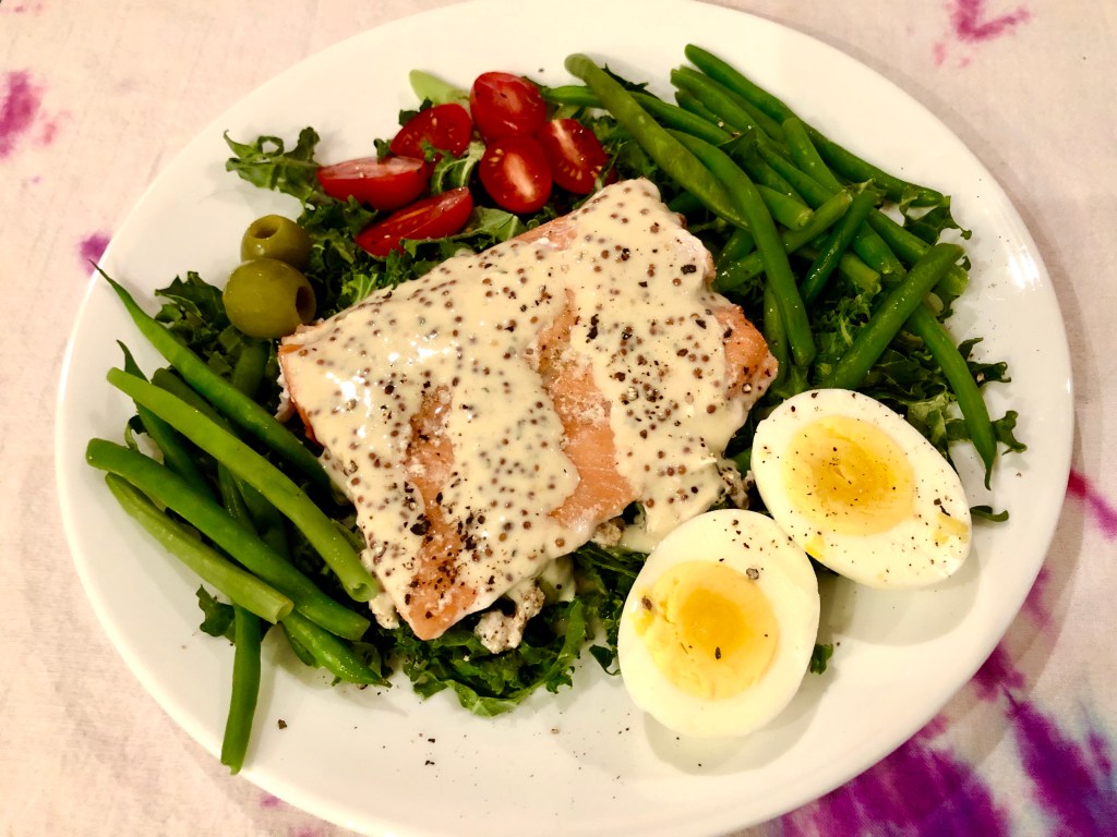 In addition to the salmon we had French green beans that were blanched, a hard boiled egg, kale, olives, and cherry tomatoes. I made a mustard sauce to dress the salad. It is about equal parts, horseradish mustard, whole grain mustard, plain yogurt, Skinny Girl buttermilk dressing, and a splash of water to thin it out.