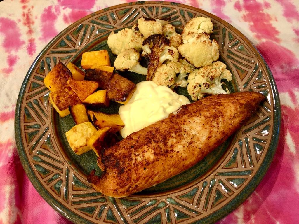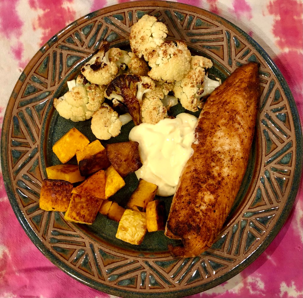 Along with the fish, I made some tartar sauce and sheet pan vegetables. The butternut squash and cauliflower turned out really well, delicious and sweet. I decided on an oven temperature of 425F on the convect setting. The vegetables were cooked in 20 minutes with some nice browning from the olive oil I tossed them in.