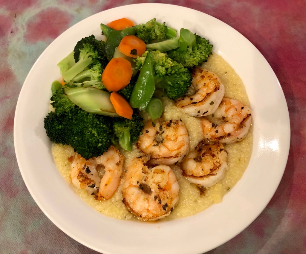 John made the polenta in a ratio of 6 parts water to 1 part polenta. The only fat he added was a tablespoon of I Can’t Believe it’s Not Butter, no cheese. He used Bob’s Red Mill polenta and maybe it is tastier than others. The end result was a lot of polenta for minimal calories. He also sautéed the shrimp to perfection seasoned with salt, garlic, and oregano.