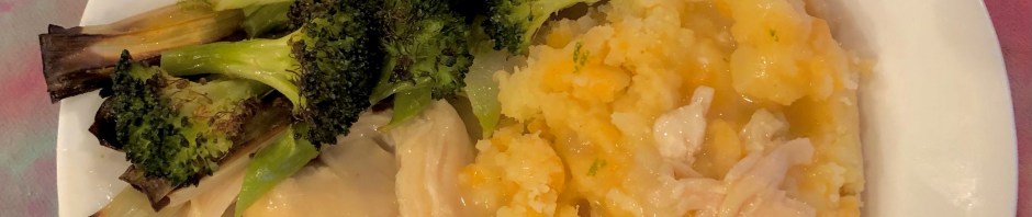 This was an easy, tasty dinner with the vegetables stealing the show. I had a little left over rutabaga mash from last Monday so I decided to extend it with a potato. Rather than peel the potato, cut it up and, and boil it I decided to just put the whole potato in the microwave and cook it until it was done (about 8 minutes on high.) Handling the potato while it was still hot I was able to easily slip off the skin. Then I mashed the potato and mixed it with the rutabaga.