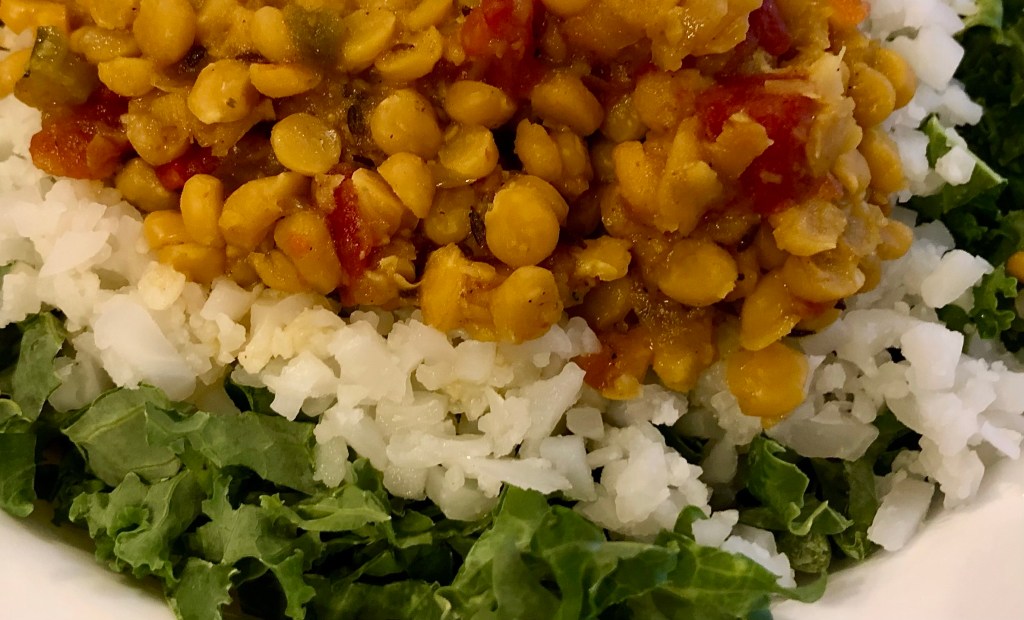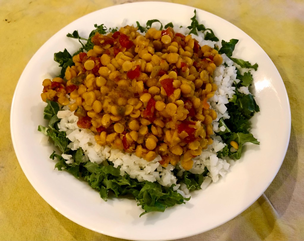 We make this dish in our Instant Pot. It cooks under pressure for 15 minutes and then we let it cool down naturally for 10 minutes before releasing the rest of the steam. To serve I put a layer of shredded kale in the bottom of the bowl followed by rice. I used cauliflower rice and John had regular white rice. The Chana dal goes on top. I like a little sriracha as a garnish.