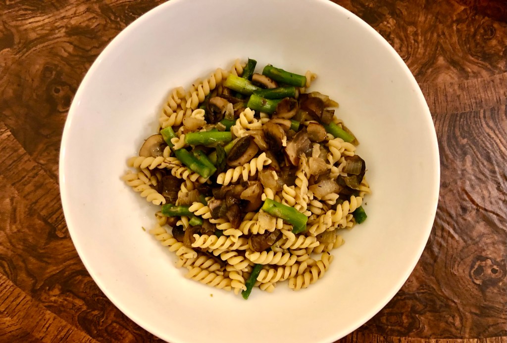 Asparagus is coming down in price as its season is beginning. It is a great Spring addition to our usual pasta plus vegetable plus mushrooms dinner. The only other ingredients are garlic, onion, oregano, and pasta water. And salt, do not forget to salt the pasta water and the vegetables as you cook them.