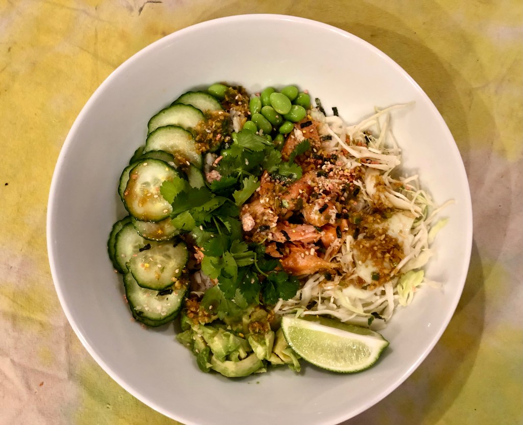 This is a family favorite. While John brines the salmon for half an hour in 1 quart of water and 2 tablespoons of table salt, I cut up the veggies (thinly sliced cucumbers, chopped avocado, cabbage shredded, and edamame) and make a dressing. The dressing consists of soy sauce, rice vinegar, a neutral oil, a few drops each of sesame oil and fish sauce, a dash of sugar, and minced ginger and scallions. The dressing doesn’t emulsify so you have to stir it up each time you use it. John quickly sears the fish and cuts it into pieces. All the bite-sized components go in a bowl with rice. We finish the dish with a squeeze of lime, cilantro, and a dusting of furikake.