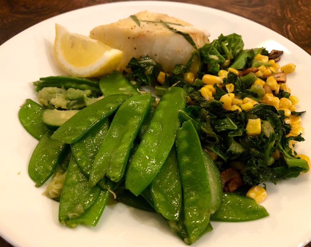 Originally we were supposed to be having new potatoes with the fish but I had too many vegetables waiting to be used in the refrigerator and decided to go with a few of them. I cooked the snow peas and zucchini in a little water and a dab of butter. The zucchini broke down a bit but the overall flavor was delicious. For the kale and corn, first I separately cooked garlic slices in a bit of olive oil. Then I cooked the kale in the garlic enhanced oil adding the frozen corn partway through and putting the cooked garlic in at the end. Yummy.