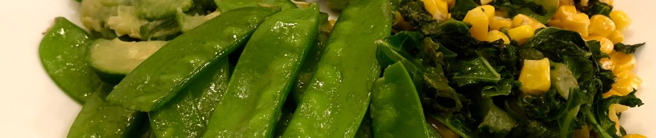 Originally we were supposed to be having new potatoes with the fish but I had too many vegetables waiting to be used in the refrigerator and decided to go with a few of them. I cooked the snow peas and zucchini in a little water and a dab of butter. The zucchini broke down a bit but the overall flavor was delicious. For the kale and corn, first I separately cooked garlic slices in a bit of olive oil. Then I cooked the kale in the garlic enhanced oil adding the frozen corn partway through and putting the cooked garlic in at the end. Yummy.