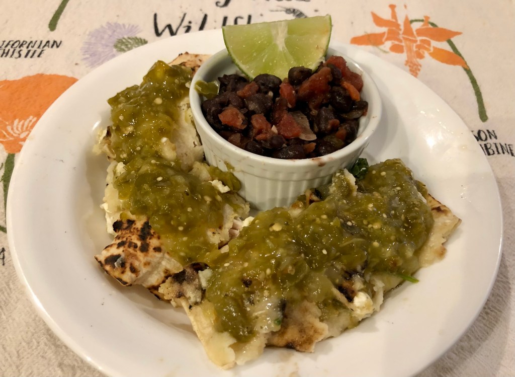 The spicy black beans are merely two cans of drained and rinsed black beans plus one can of Original Rotel, a spicy tomato and chile preparation. Heat until warmed through.