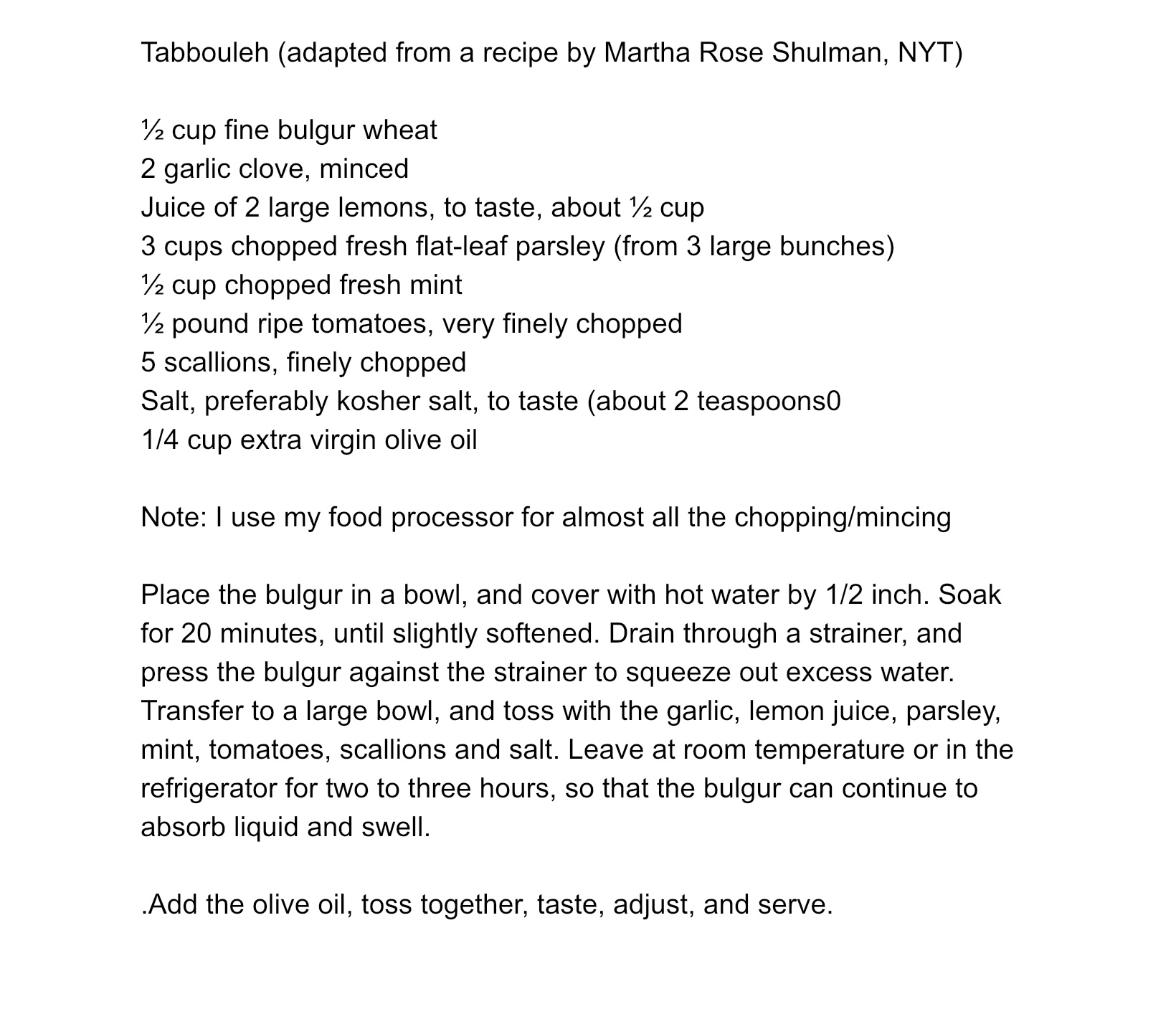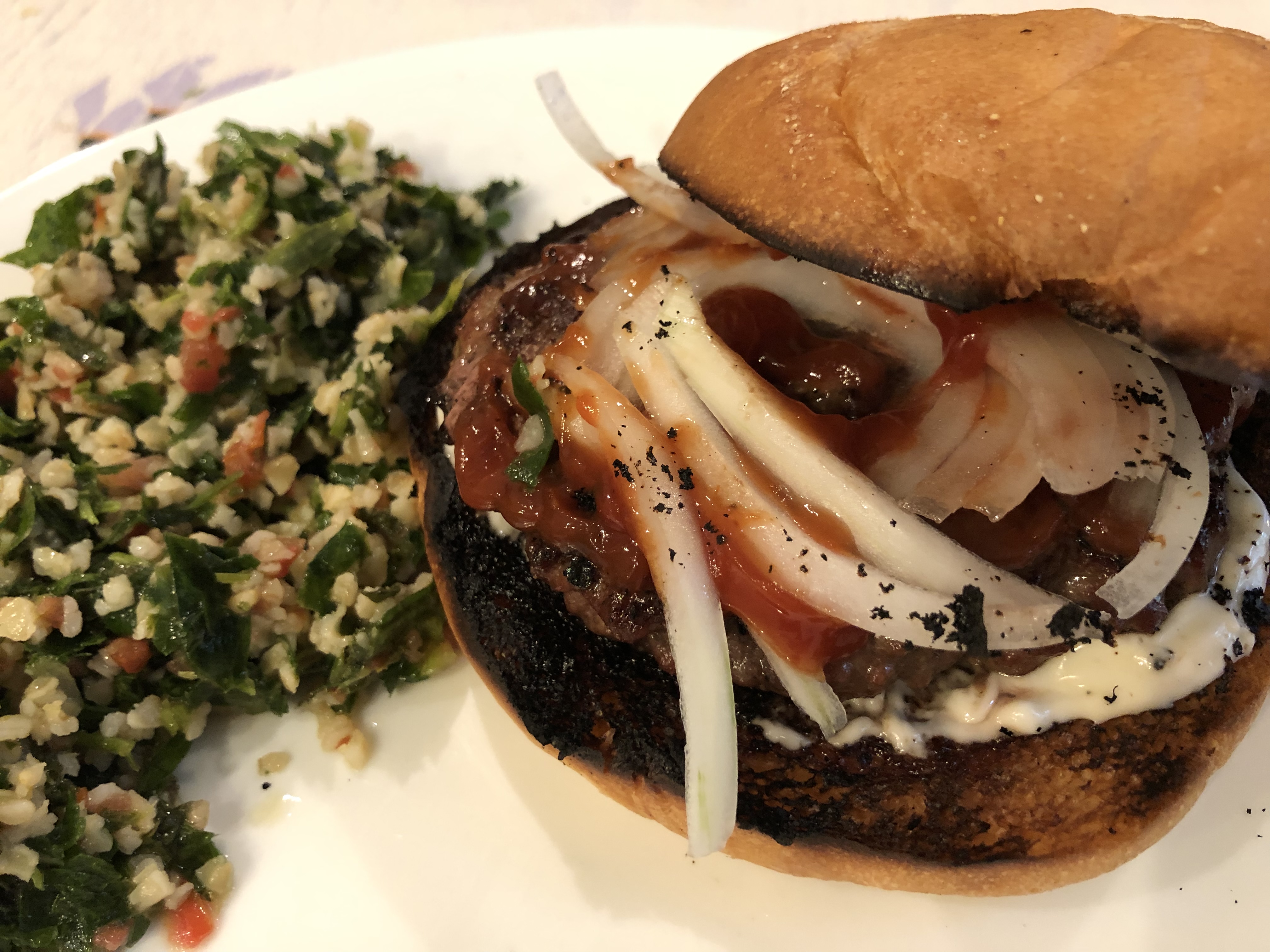 John grilled the hamburgers perfectly. He added salt and baking soda to the ground beef which makes them extra juicy. I made the tabbouleh. Here is my recipe. I think it is very tasty.