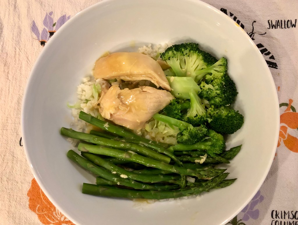 Rotisserie chicken and McCormack’s chicken gravy took care of the protein portion of our dinner. Unfortunately the white rice we were planning on having had languished in the refrigerator too long so it got pitched. I had been planning on half cauliflower rice anyway so I just added some slivered cabbage to it for the base of my dish. Steamed broccoli and asparagus made up my last two veggies.