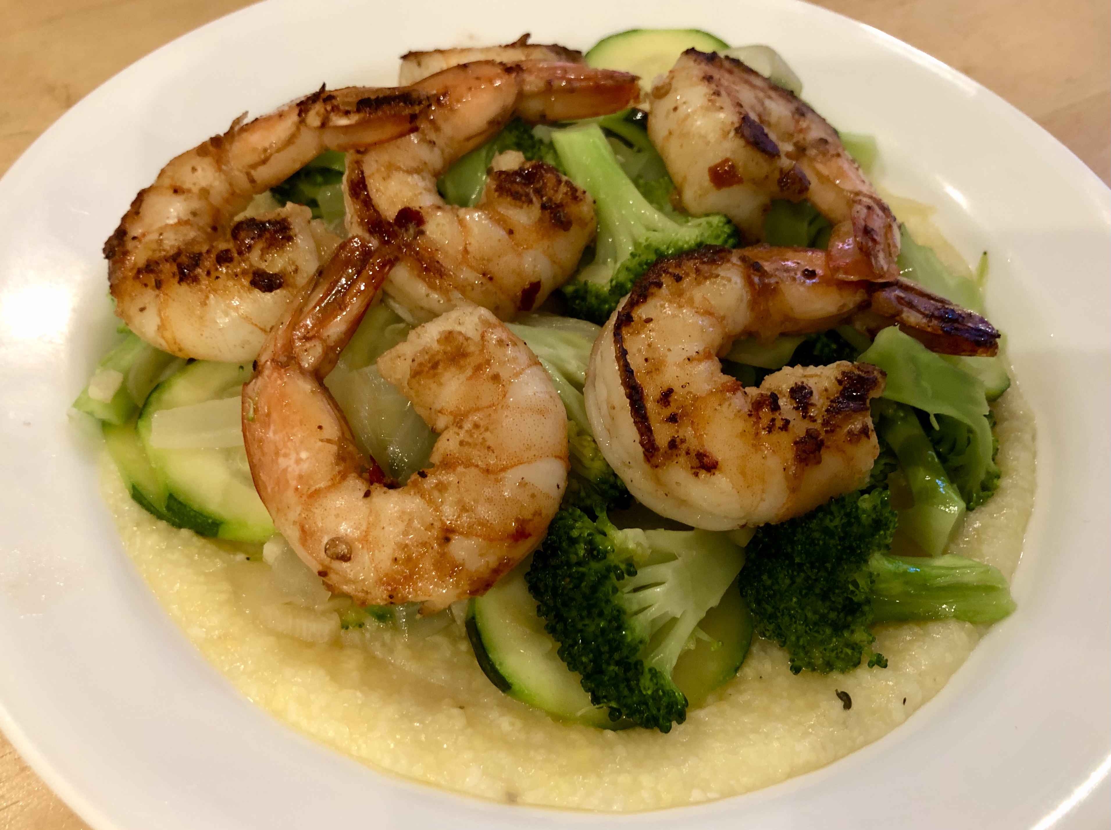 Shrimp with vegetables over polenta is our version of shrimp and grits. John uses Bob’s Red Mill polenta and makes it in a ratio of six parts water to one part polenta. One half cup of polenta turns into quite a lot. He adds salt and a tablespoon of faux butter so these are pretty healthy grits. He also cooked the shrimp in a touch of olive oil and olive oil spray until they were brown and just cooked through.