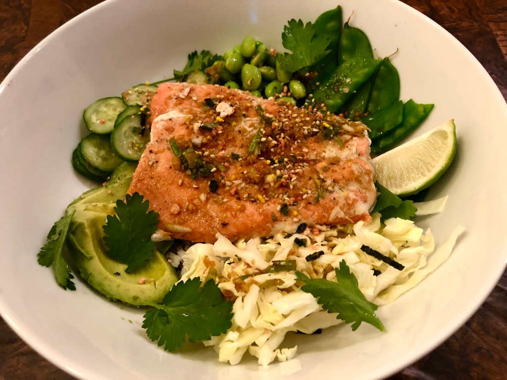 This salmon bowl is half hot entree, half salad, and one hundred percent delicious. John cooks our salmon on one side after a 20 minute brine starting in a cold pan over low heat. When the fish is cooked to around 125F, he turns off the heat and flips the fish over so that the top surface has a little sear from the still warm pan. He removes the skin at this point.