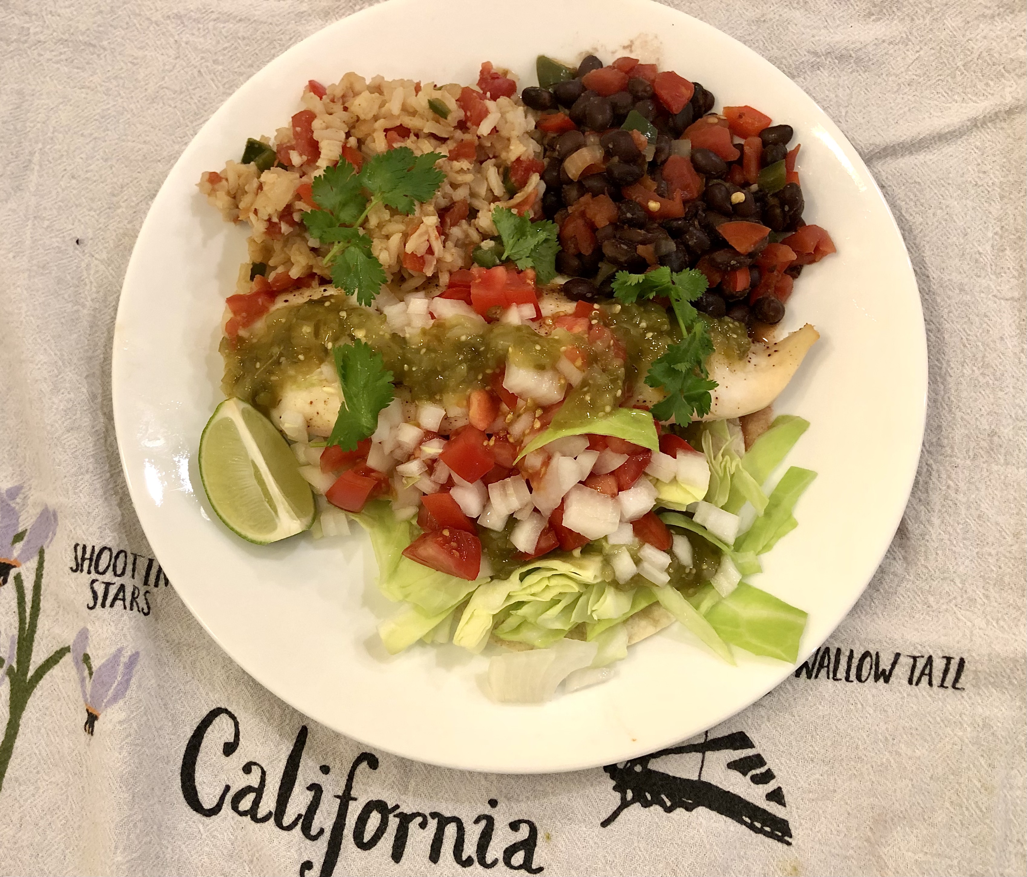 The fish we used was talapia that John roasted in the oven. I sauteed some red bell peppers, poblano peppers, and onions and then put half of that mixture in a can of black beans and the other half in cauliflower rice and white rice. The rices and beans also had half of a can of Rotel, a healthy dose of cumin, and some cilantro. This was an easy and fun dinner with everyone choosing the toppings they liked best.