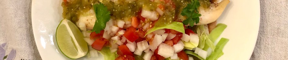 Underneath the cabbage, tomatoes, onion, and salsa verde there is a fish fillet and a corn tortilla. This is my version of a taco, a whole bunch of things piled on a tortilla. Folding a tortilla up and eating it out of hand means that the whole experience happens too quickly. I like my dinners to last longer than a few minutes!