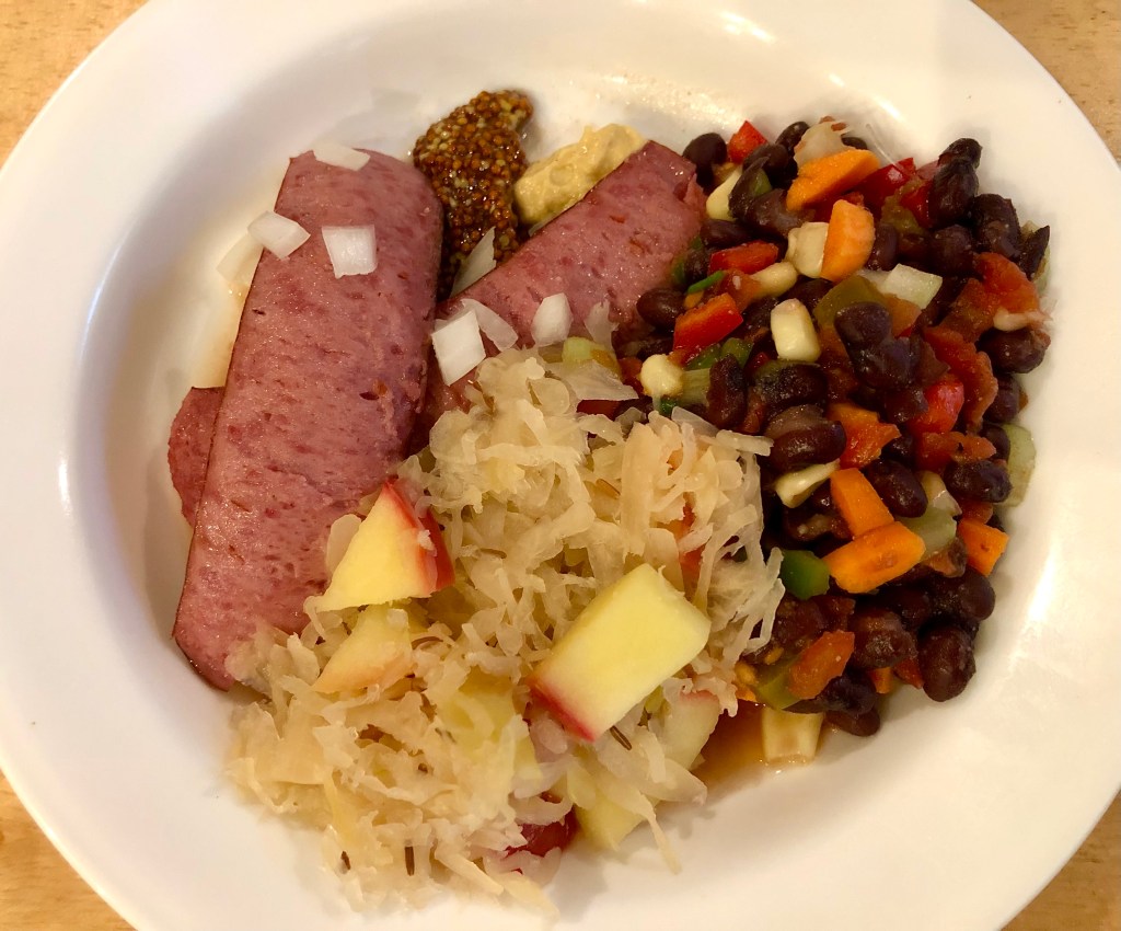 Extremely hot weather here in NorCal means we have had to switch gears for our dinner preparations. Our daughter said to me, ”You’re not making a stew and pasta on Tuesday and Wednesday, are you?! Temperatures for those days border on almost 100F. So, no, we are not making stews and boiling pots of water. We are trying to keep the kitchen as cool as possible. Ergo, turkey kielbasa and sauerkraut that we can make with brief cooking in the microwave and a bean salad.