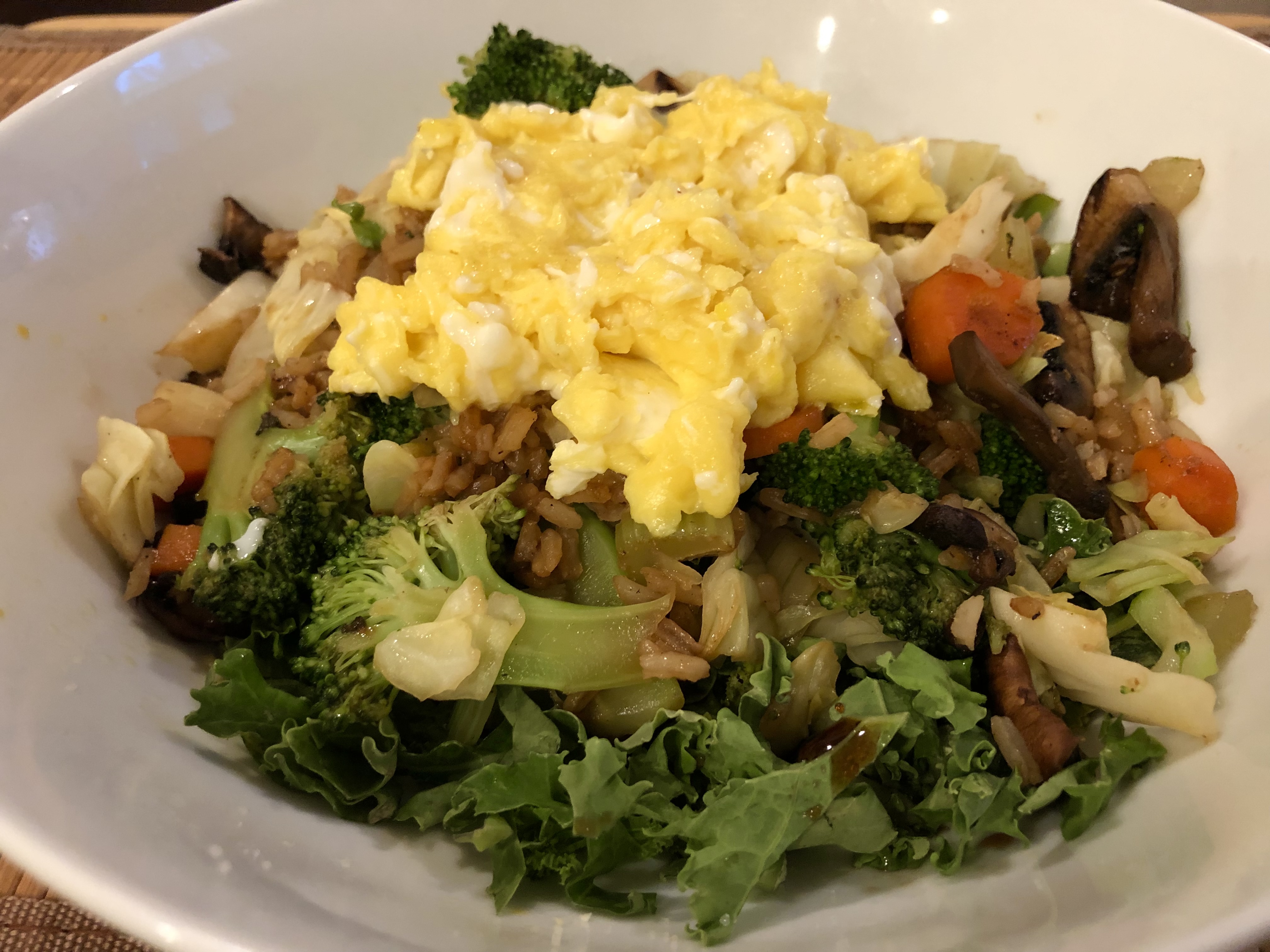 My Breakfast For Dinner of stir-fried vegetables and eggs is one that I really enjoy. First I laid down a bed of shredded raw kale and put a veritable garden of stir-fried vegetables mixed with a little rice on top of the kale. The vegetables I used were broccoli, onion, cabbage, mushrooms, carrots, and celery. It was all seasoned with salt, garlic powder, and soy sauce. I cooked the softly scrambled eggs separately and laid them on top.