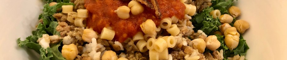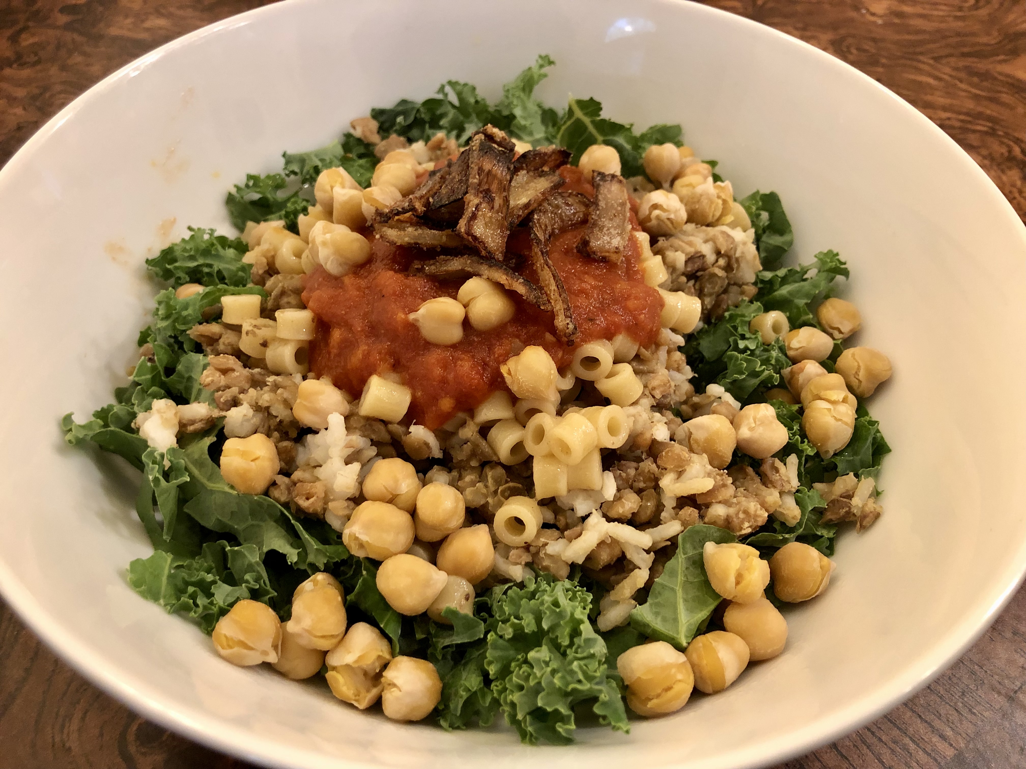 According to The Mediterranean Dish, the website where I found this recipe, koshari is “an Egyptian comfort bowl of lentils, rice, chickpeas, with a special tomato sauce and savory crispy onions on top!” I think I made it even more comforting for me by adding in the leftover farro we had and putting the whole thing on a bed of kale. It is a glorious mixture of yummy legumes and rice laced with coriander and garlic with a spicy, acidic tomato sauce and fried onions.