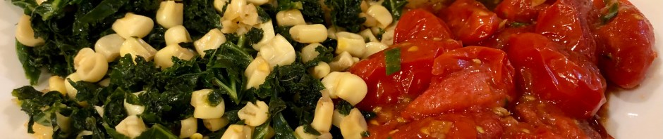 I have to pat myself on the back for how delicious the vegetables turned out. The bitterness of the kale was great against the sweetness of the corn and garlic. Blistering cherry tomatoes is something I have not done before. It is super easy. Heat up some olive oil in a pan and when it is hot put the tomatoes in. Let them just sit there for 2 minutes and then flip them over and add salt and minced garlic . Cook them another 2 minutes. Take them out and sprinkle on some shredded basil. Yum!