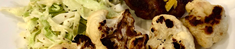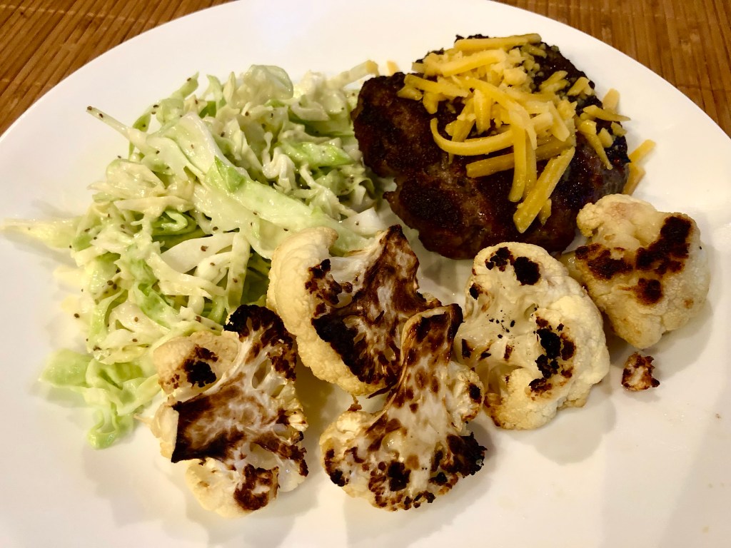A hot day calls for cooking outside. While I made a cool cole slaw indoors, John cooked the burgers and cauliflower on the grill. While John and our daughter had burgers on sesame buns, I had mine without the extra carbs. I loved the grilled cauliflower and the cole slaw worked out well too. I am thinking of more grilled vegetables this summer!