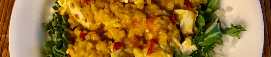 After sautéing cumin seed, onions, garlic, spices, and ginger in a little oil add the lentils plus some water or stock and cook until tender, about 20 minutes. Use rice or cauliflower rice as a base, cover the rice with raw kale, and then ladle on the red lentils. For some extra zing, I garnished with sriracha.