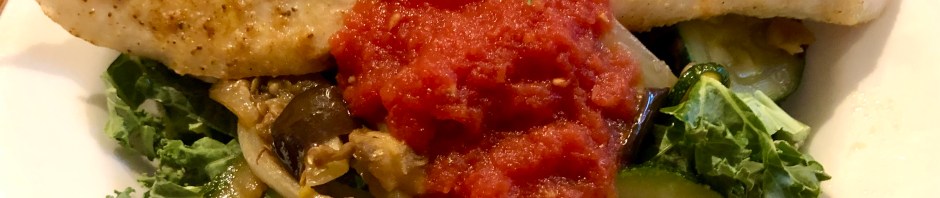 I constructed my low bowl with raw kale on the bottom, a terrific melange of sauteed onions, garlic, eggplant, zucchini, and fennel next, a perfectly roasted piece of tilapia (thanks to John) on the vegetables, and a spicy, sweet tomato sauce on top.
