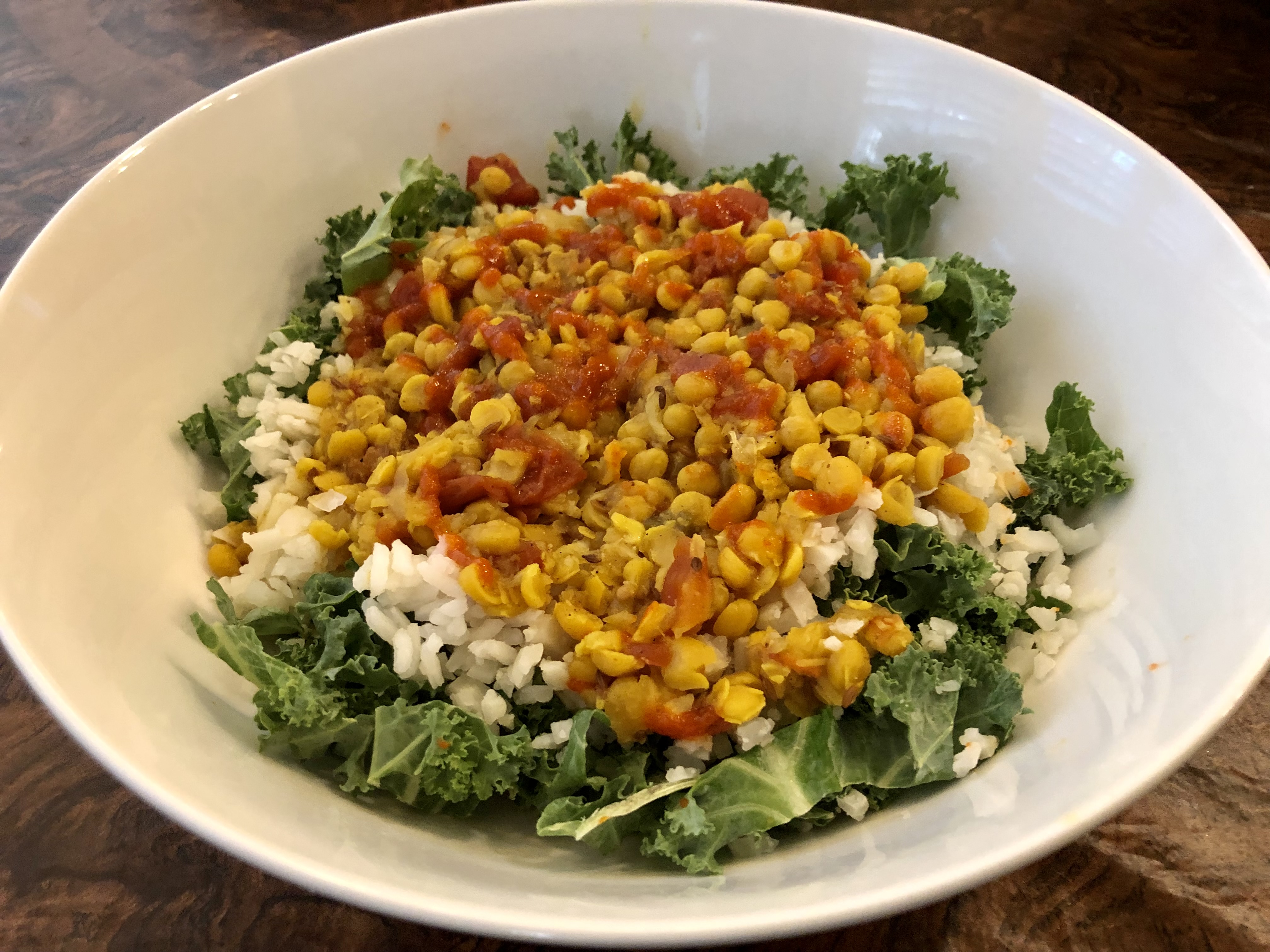 Chana dal is probably our favorite Indian dish. It is a stew of dried split chickpeas with spices, onion, ginger, garlic, and spicy tomatoes. I make it in my Instant Pot where it cooks under pressure for 15 minutes. I serve mine with a layer of raw kale followed by cauliflower rice and then the Chana dal on top. My sisters are always telling me that they do not like Indian food because they do not like curry as if every Indian dish is a curry. This delicious dish is curry-free but there is no convincing some people. For extra spice I like to drizzle some sriracha on top.