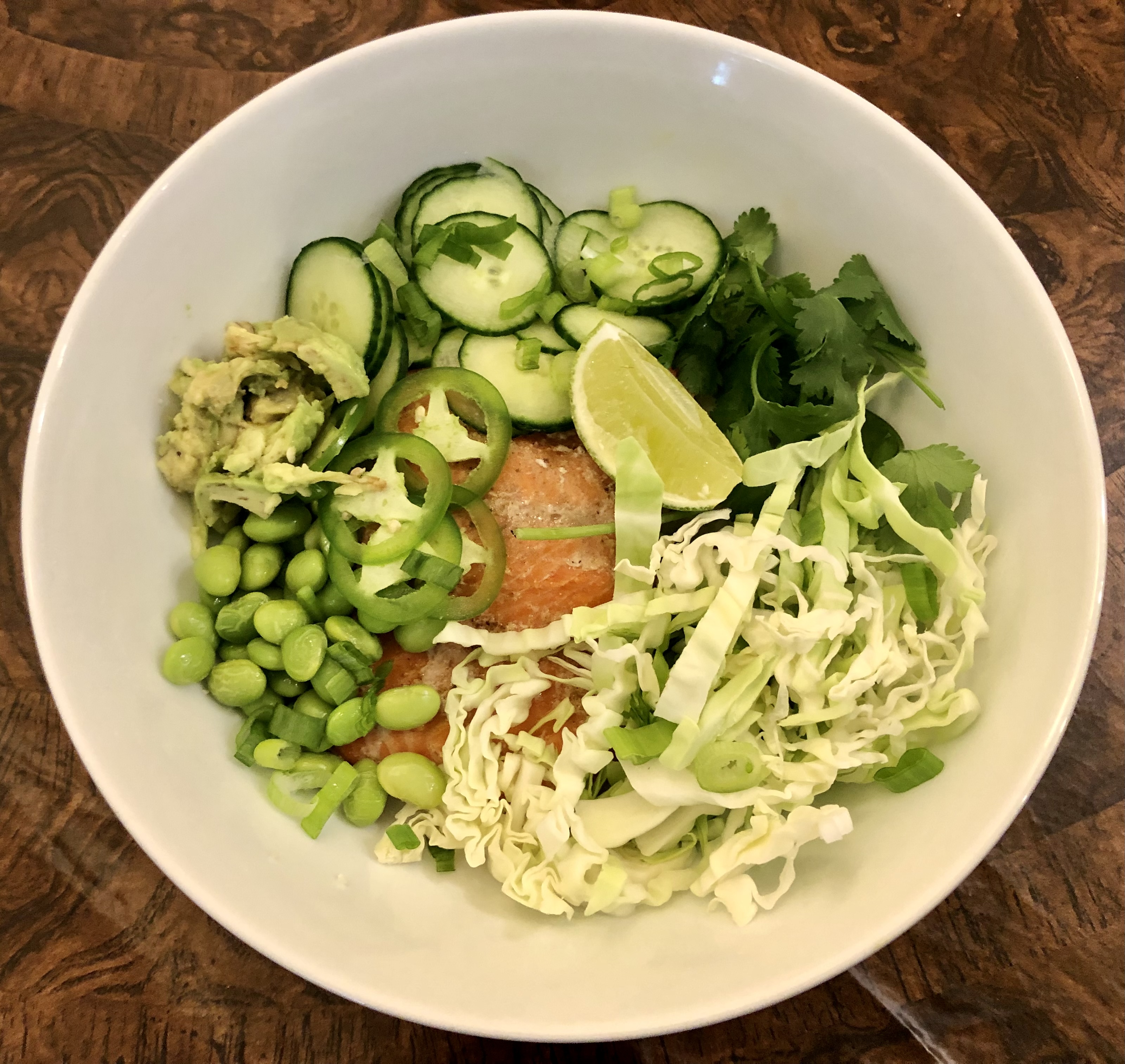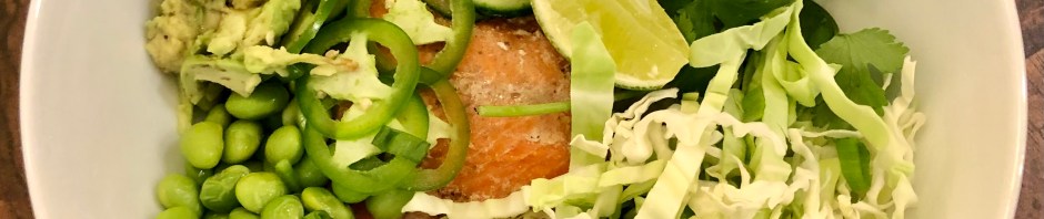 This dish also comes with a gingery soy vinaigrette which I had not put on yet.There are so many contrasts in this bowl. The cauliflower rice and the salmon are warm while all the other components are cold. The vegetables are crunchy but the avocado and the edamame are creamy. The vinaigrette is full of contrasts as well, acidic, salty, and a little sweet. I posted the recipe for the dressing last week when we had a similar dish but made with shrimp. Salmon, shrimp, or tofu bowls belong in your weekly rotation. They are easy to make, good for you, and delicious to eat!