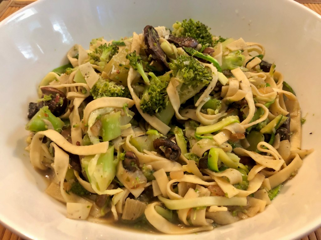 Our dish has onions, garlic, salt, oregano, red pepper flakes, mushrooms, two stalks of broccoli, and two zucchini. The zoodles that we made we tossed into the vegetable combo at the same time as the cooked pasta. With zoodles you have to be careful not to cook them much or they turn into mush. Depending on whether you want ot keep it vegan or not you can add some parmesan cheese as a garnish.