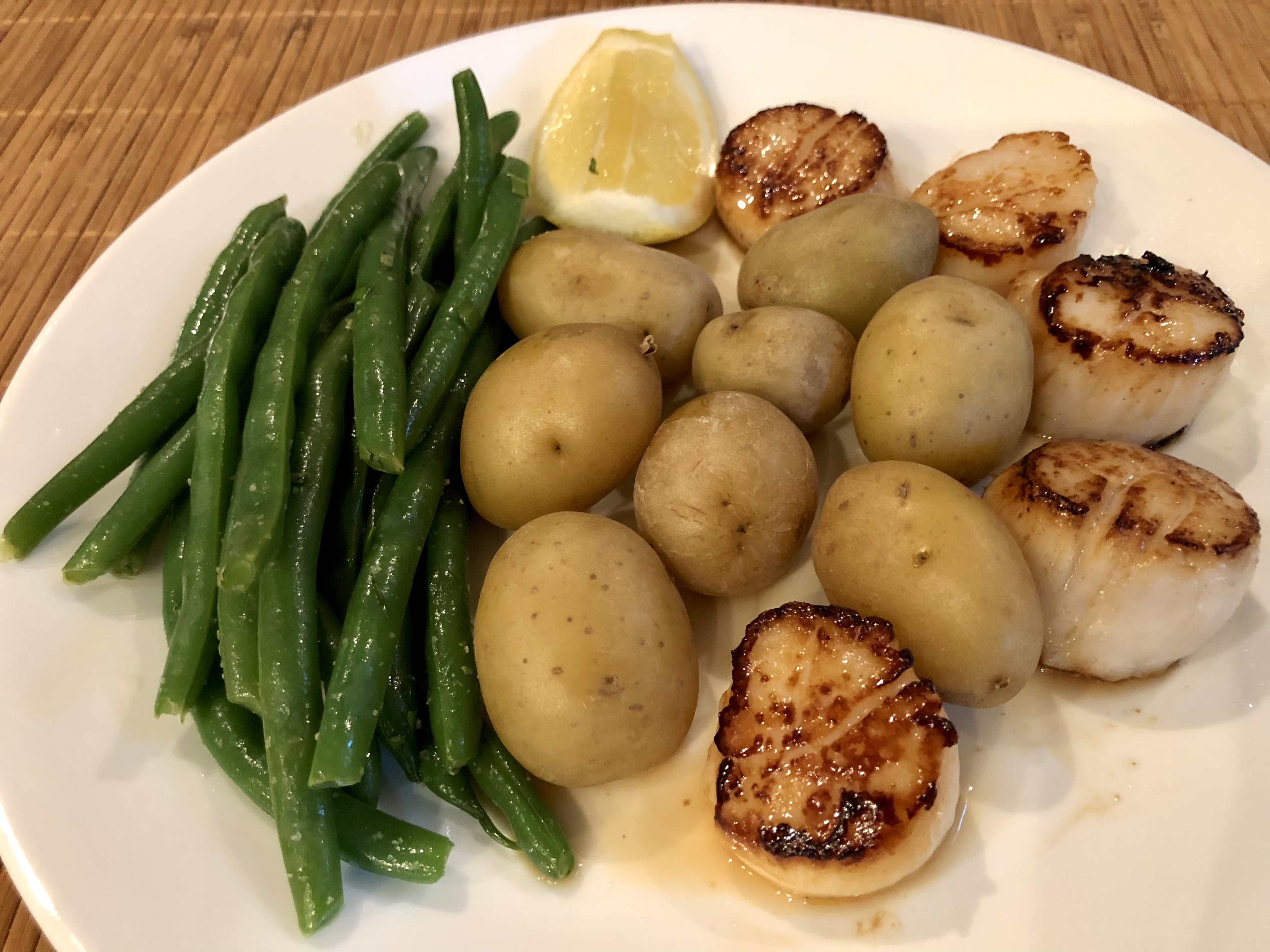 This is a simple but delicious dinner. The potatoes start first in a steamer basket over boiling water. They take 15 to 20 minutes. When they are done I put them in a covered bowl to keep warm and after adding more water to the steamer pot I add the green beans. In the meantime John heats our cast iron pan with a little neutral oil. In the time it takes to steam the beans the scallops are seared with a small dollop of butter at the end of cooking. I add a spritz of butter spray and some chopped chives and tarragon to the beans. A slice of lemon is all that is needed to complete our plates.