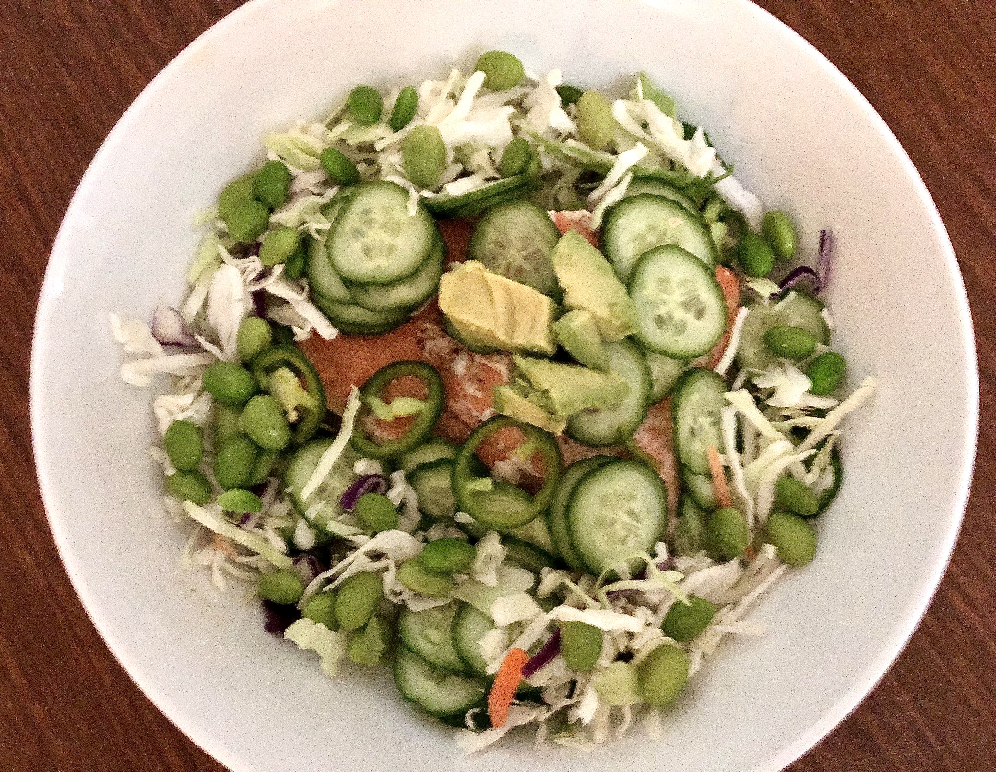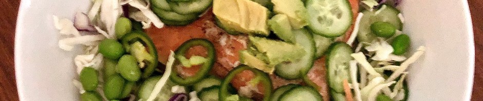 Salmon or shrimp bowls are a frequent choice for dinner at our house. This is an especially good dish during hot weather since the only cooked components are the salmon which cooks on low on the stovetop and cauliflower rice that is heated up in the microwave. (Or you can use regular rice.)