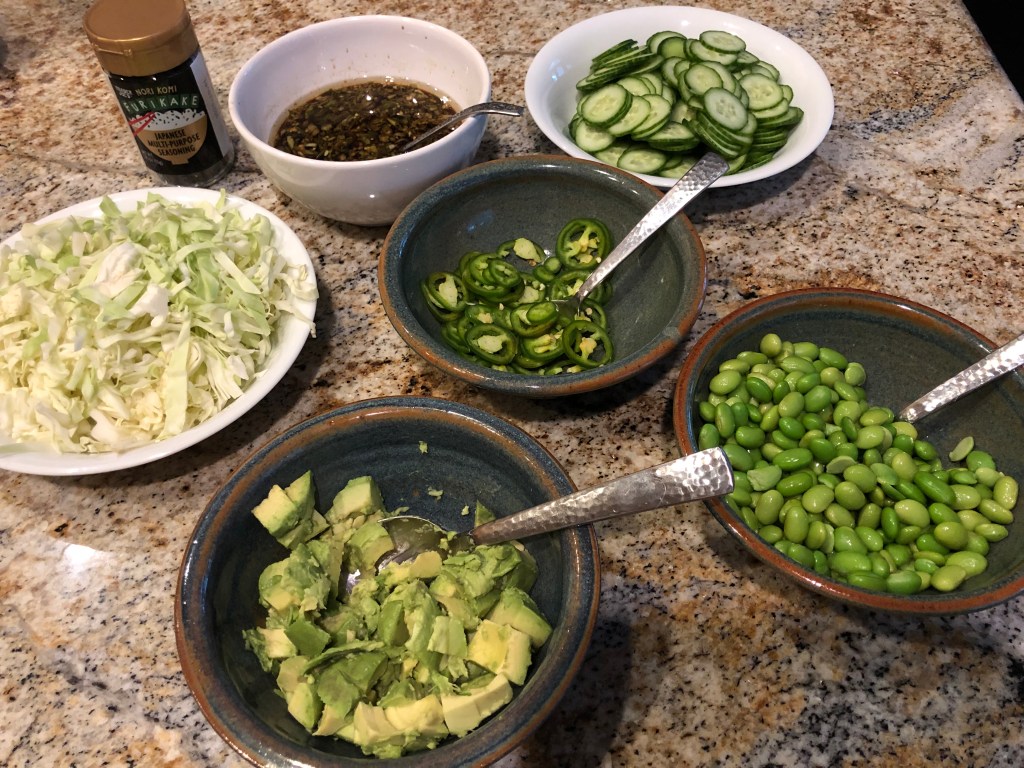 I set the cold components on the counter and let everyone fix their bowls as they like. The dressing which is not on my bowl yet in the picture is a combination of 1/2 cup soy sauce, 1/3 cup rice vinegar, 1/4 cup neutral oil, and finely chopped garlic clove, thumb of ginger, and 2 scallions. I use my mini food processor on the last three ingredients. You can also add a pinch of sugar or sweetner according to your taste. This is not an emulsified dressing. We also like to sprinkle on furikake as a garnish.