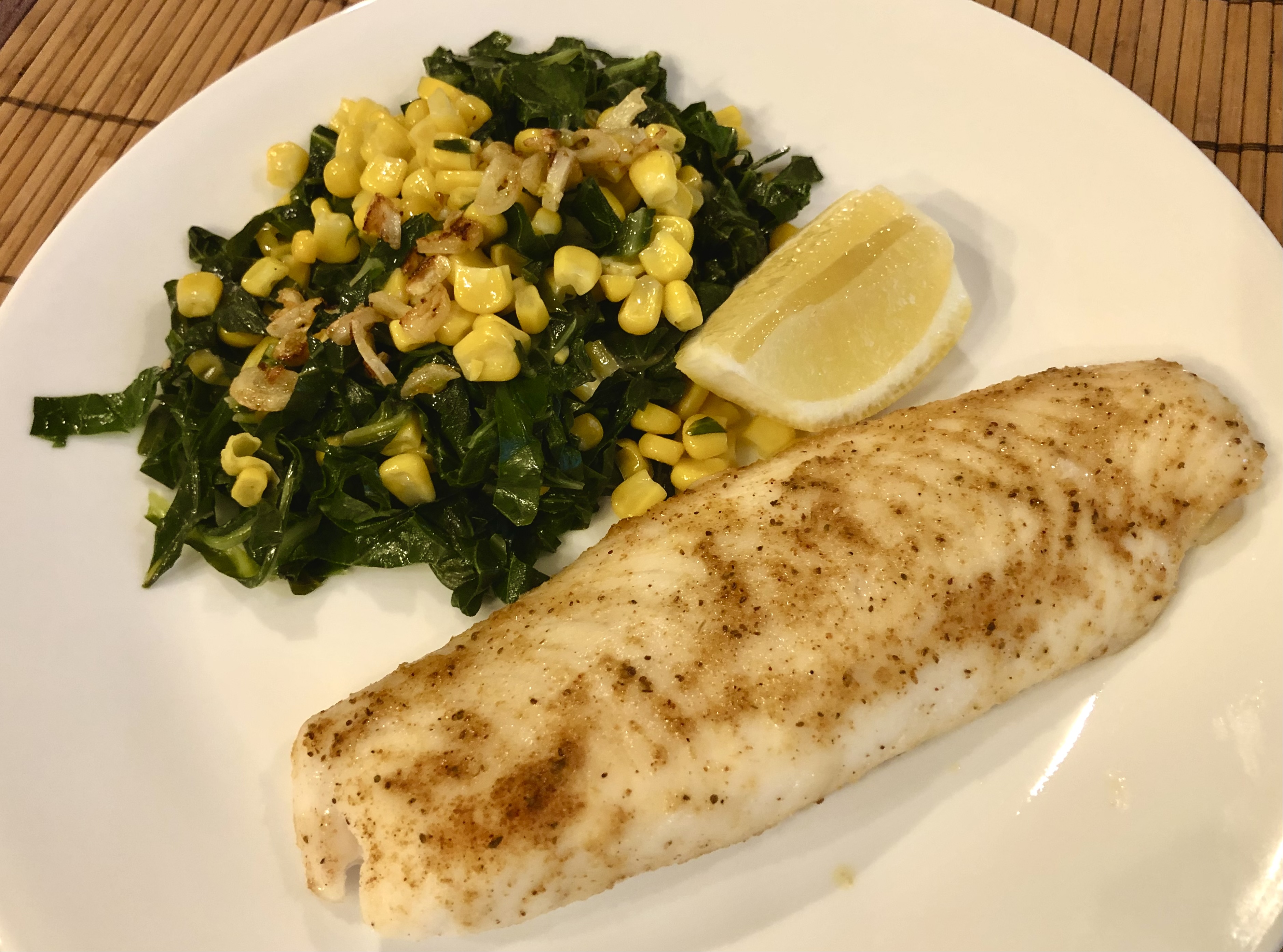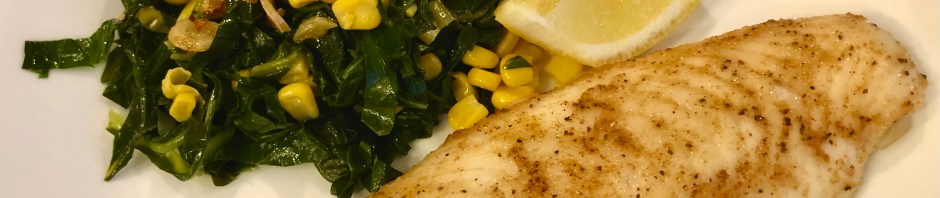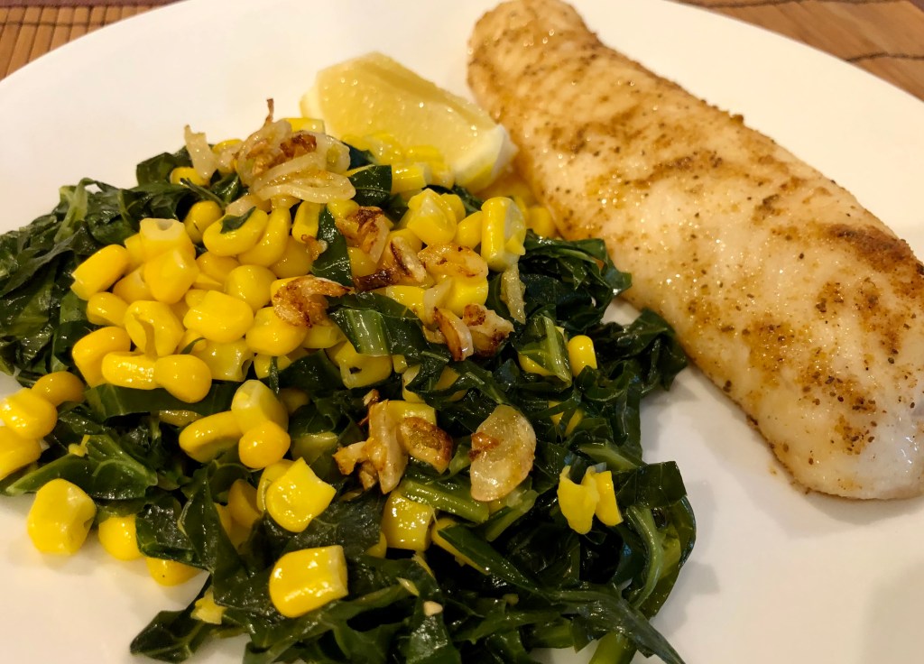 Easy dinner tonight. John seasoned the fish with salt, garlic, paprika, and Old Bay then baked it in a 400F oven for 12 minutes. To make the collards and corn, first I sautéed sliced garlic until it was golden and then set it aside. Then I put the collard greens which had been stemmed, cut into a chiffonade, and then rinsed into a sprayed pan. I added a cup of frozen corn, a half teaspoon of butter, salt, a half teaspoon of apple cider vinegar, and a sprinkle of sugar. The chard has plenty of water clinging to it so none additional is needed but adjust with more water if your pan is drying out. Cook for about 8-10 minutes. Garnish the greens with the sautéed garlic.