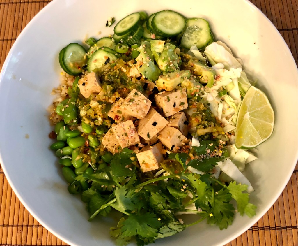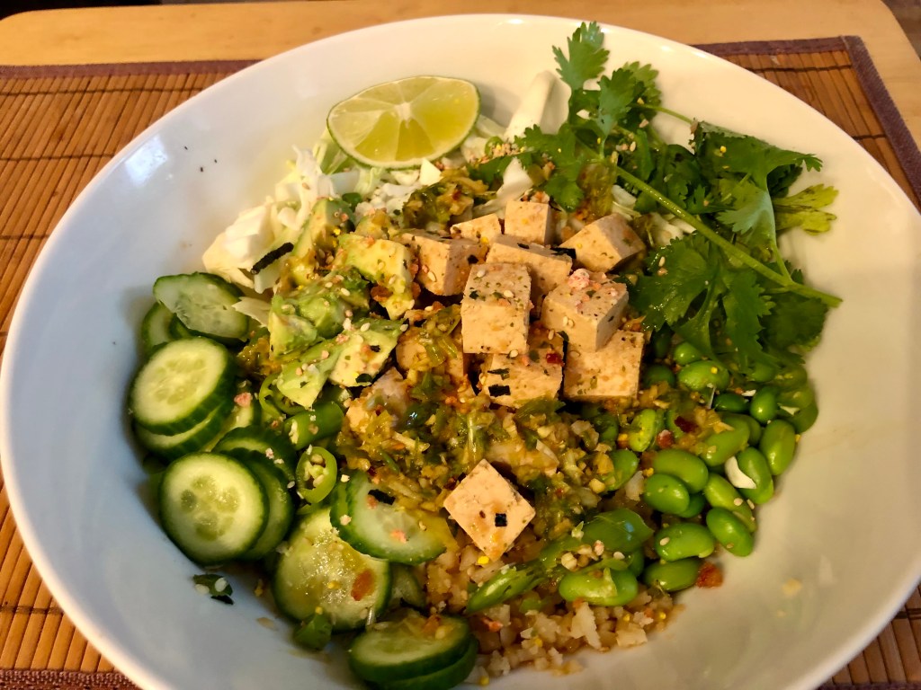 This is the ultimate hot summer night dish! I have been making these bowls primarily with salmon and shrimp but decided I wanted a vegan version. The family voted three thumbs up for this marinated extra-firm tofu bowl with cucumbers, avocados, edamame, Thai chiles, and cabbage over rice.