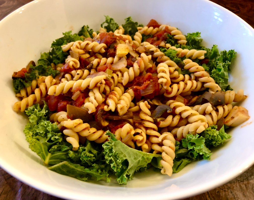 I cooked the chopped, peeled tomatoes, spices, tomato paste and canned tomatoes for about half of an hour before adding the sautéed onions, garlic, and mushrooms. John added the cooked pasta to the sauce and I swirled it around and added a half cup of pasta water to finish the cooking. I served the pasta on a bed of raw kale and garnished my bowl with a drizzle of good olive oil.