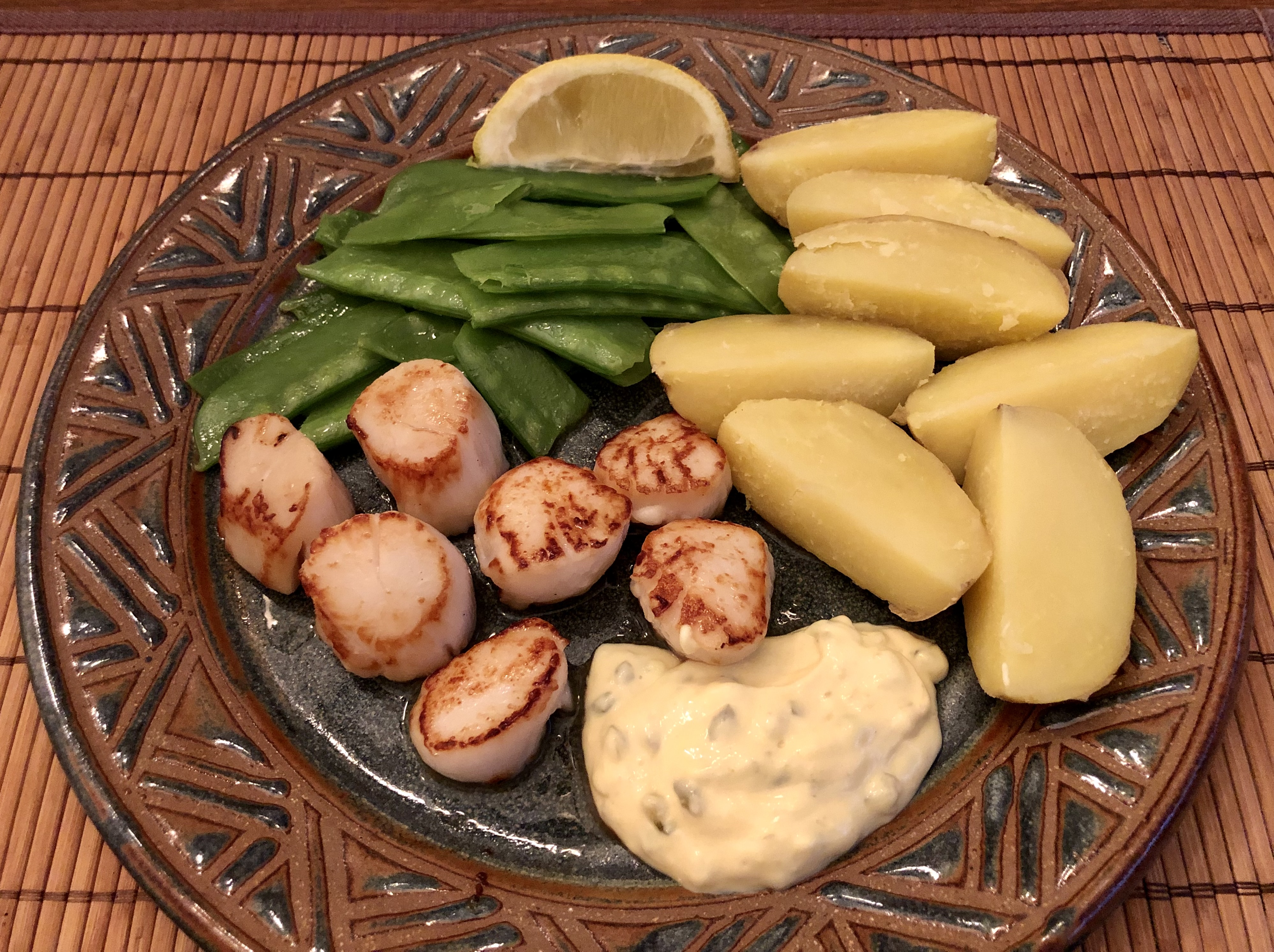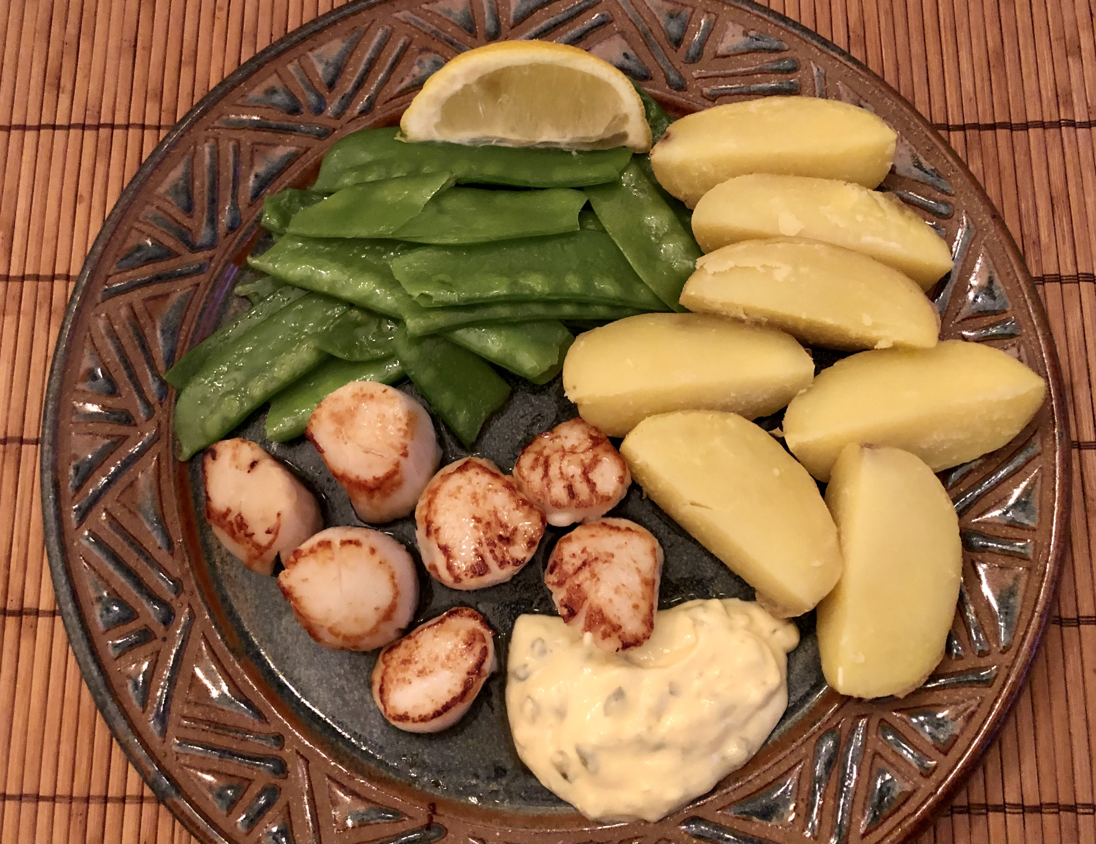 John and I sat in the dining room for dinner tonight. Usually we are in the family room with the TV on but we decided that scallops needed our full attention. John was in charge of searing the scallops and I was in charge of the potatoes, the snow peas, and the tartar sauce.