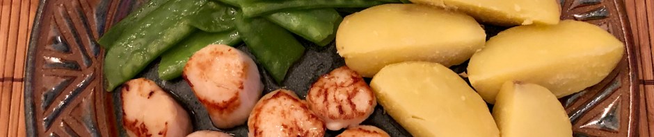 At this point John sprang into actions and heated the cast iron frying pan to cook the scallops. I put the snow peas on at the same time. Both the scallops and the snow peas take very little time.