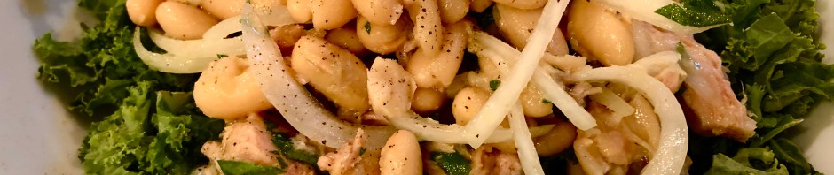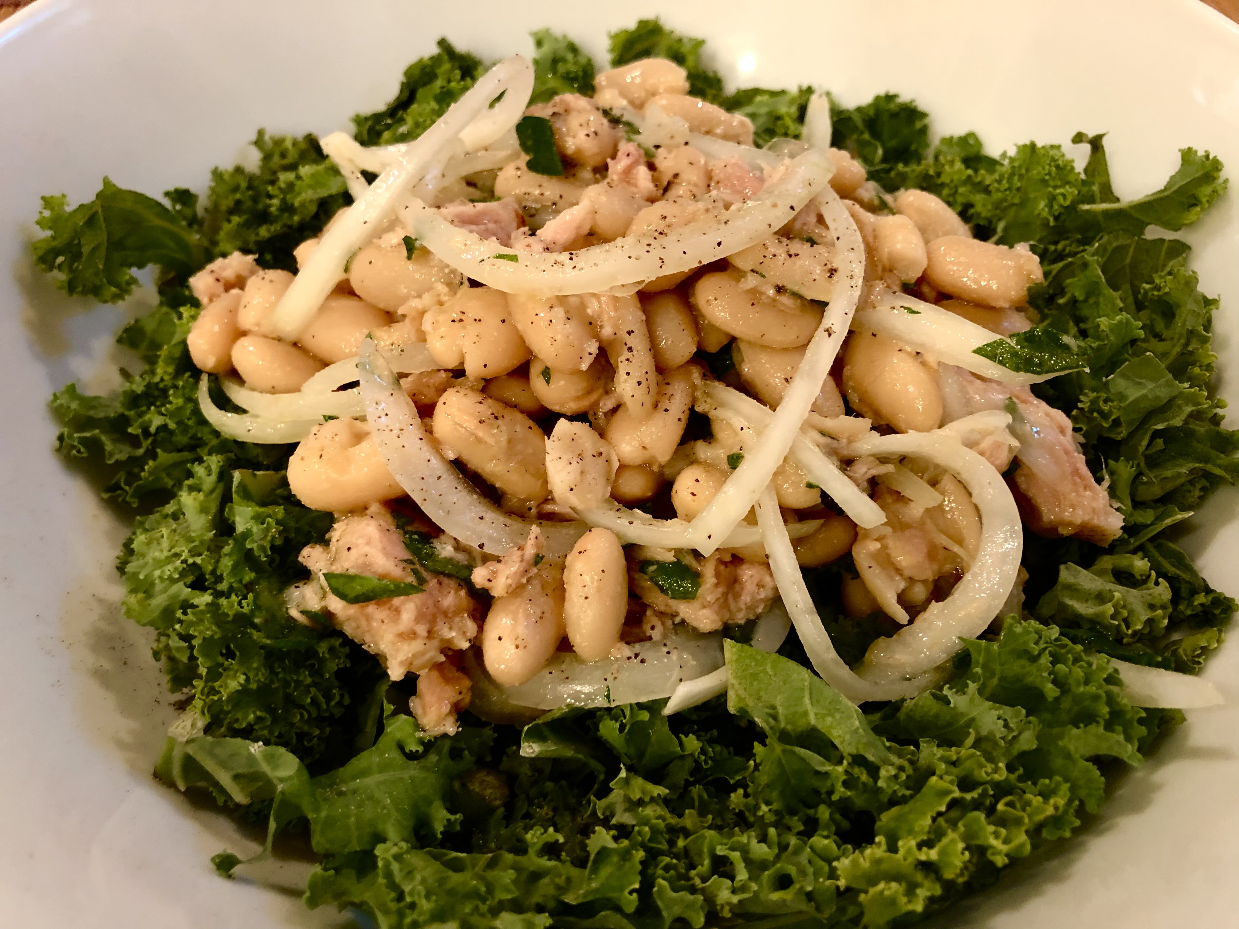 Dinner prep consisted of opening a couple of cans of cannellini beans, a can of tuna, quick-pickling half an onion sliced thinly, and making a vinaigrette. I also had John pulverize 12 juniper berries in a mortar and pestle. We like the taste of them with cannellini beans. We put our beans and tuna over a bed of raw kale.