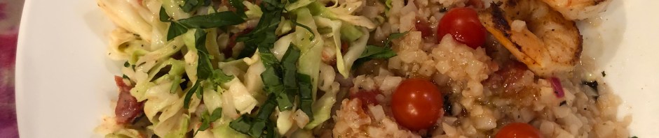 Granted this is not a pretty plate of food but it tasted good. We needed a dinner that would have minimal cooking because it was over 100F. Originally John was going to put the shrimp on skewers and cook them outside on the grill but standing over a hot grill on a super hot day seemed like a bad idea. So he gave them a quick sear in a skillet.