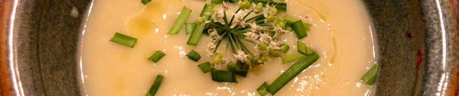 Into the Instant Pot put one roughly chopped onion, 3 leeks (white parts only), cleaned and cut into half moons, one clove chopped garlic, two pounds of russet potatoes, 32 oz. of chicken or vegetable stock, and 1 teaspoon of table salt. Set the Instant Pot on Soup for 10 minutes. When the cooking is complete vent the steam. Using a stick blender, purée the soup. Add 1/4 cup (or more) of heavy cream. Taste for salt level. Chill. In order to get my soup chilled in time for dinner I put the entire metal bowl from the instant Pot in a larger bowl of ice water. That cooled it down somewhat. To get it chilled the rest of the way, I put containers of soup in the freezer for 40 minutes. When serving I garnished the bowls with chives and chive flowers plus extra virgin olive oil.