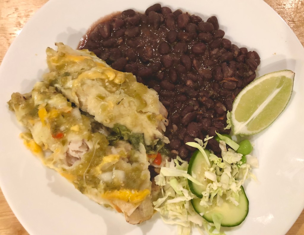 Tonight’s dinner is all about ease. Buy a large jar of salsa verde, corn tortillas, shredded Mexican blend cheese, and pulled leftover cooked chicken, a rotisserie chicken, or the easiest, a pack of cooked white meat chicken from Costco. Shred the chicken. Put a layer of salsa verde down in a 9 X 13” baking dish. Heat the tortillas over an open flame until they are supple. In each tortilla put some chicken, salsa verde, and cheese. For extra flavor add chopped onions and Serrano chiles. Roll them up and put them in the baking dish seam side down. When you have completed all your tortillas cover them with salsa verde and sprinkle on any remaining cheese. Bake in a 350F oven until the cheese is melted and the casserole is bubbly, about 1/2 hour. I fit 12 enchiladas in my dish which is slightly smaller than standard size.