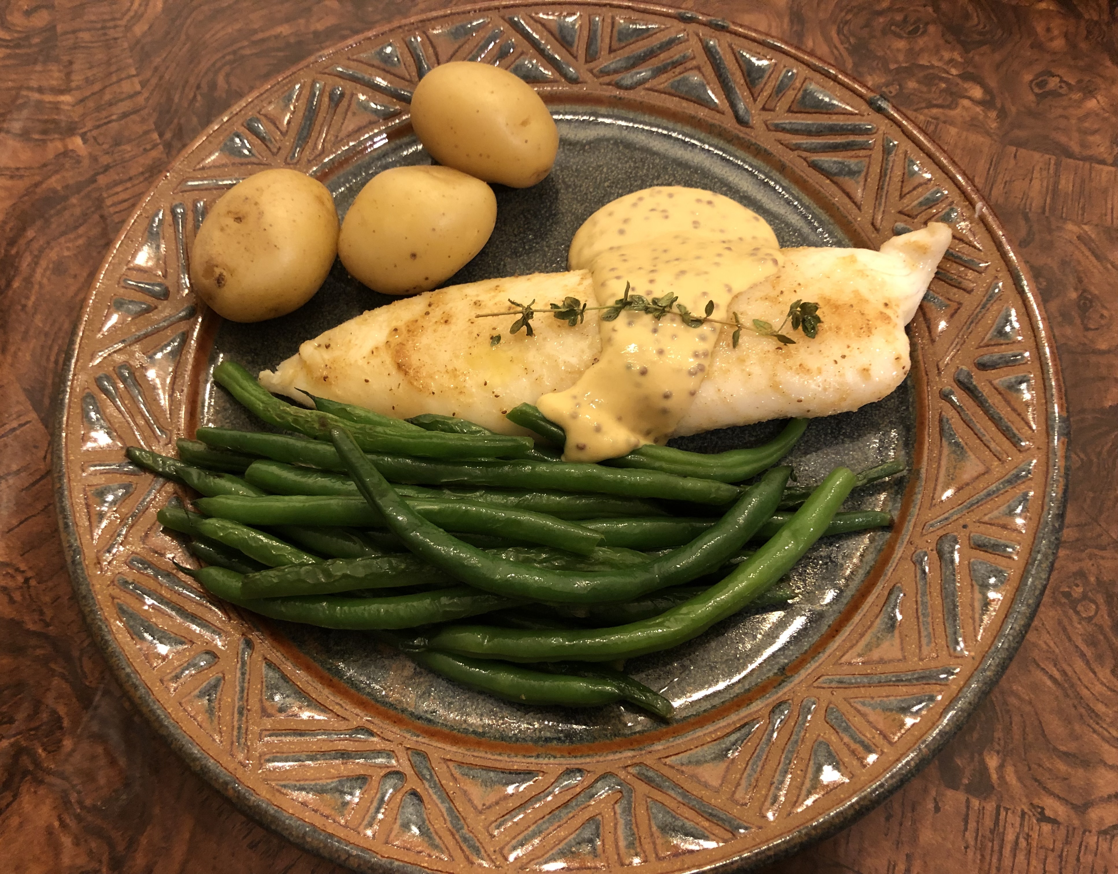 It certainly seems easy. He seasons up the fish and bakes it in a 400F oven for 15 minutes and, voila, the fish is cooked perfectly. In the meantime I get to steam the potatoes, sauté the green beans, and make a mustard sauce. Somehow that does not seem like an equal division of labor! But it works for us.