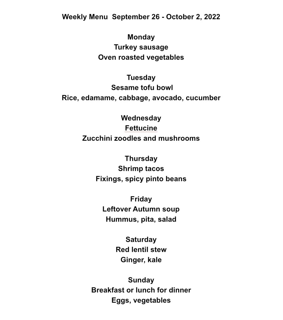 This week’s menu includes five vegan or vegetarian meals, one shellfish, and one turkey sausage dinner. Including more plant-based meals now seems like the norm and I am very happy about that.
