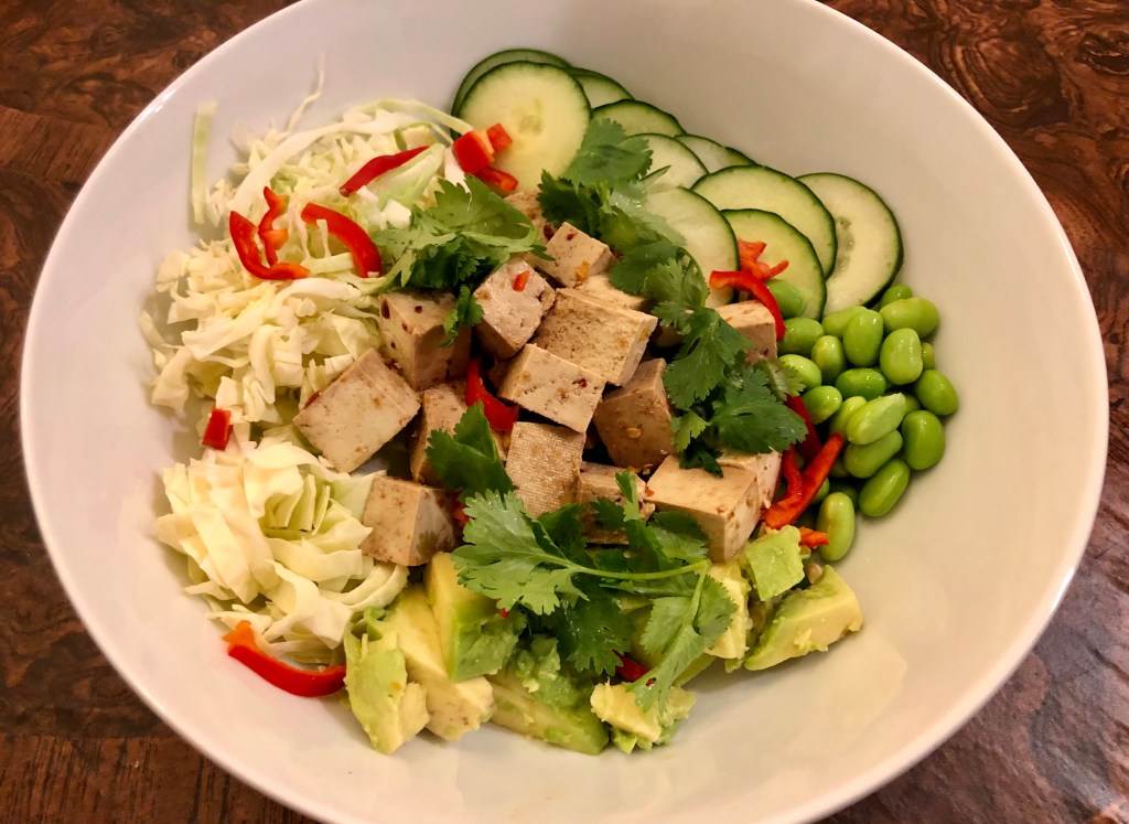 I made the vegan version of the sesame bowls I have been making. The bowl pictured here is waiting for its scallion-ginger-soy vinaigrette. We have one of these almost every week rotating through tofu, shrimp, and salmon. My daughter mentioned today that avocados are on sale this coming week. I rejoined that I could not make the same thing over and over again. She said why not? Good question! The bowls are simple to make and delicious!