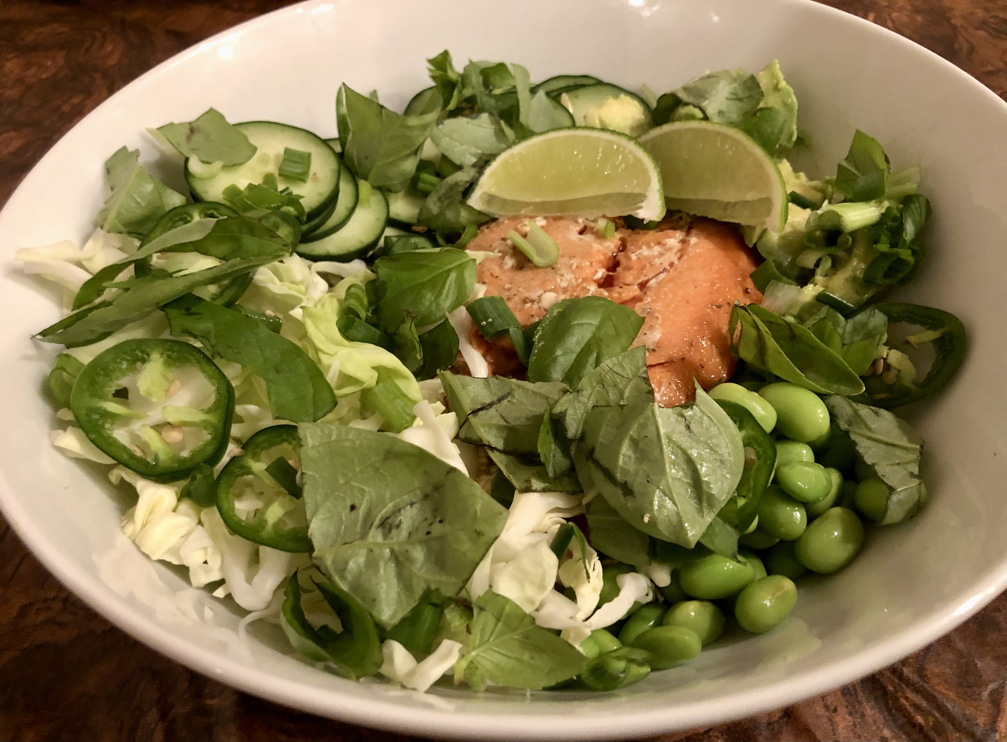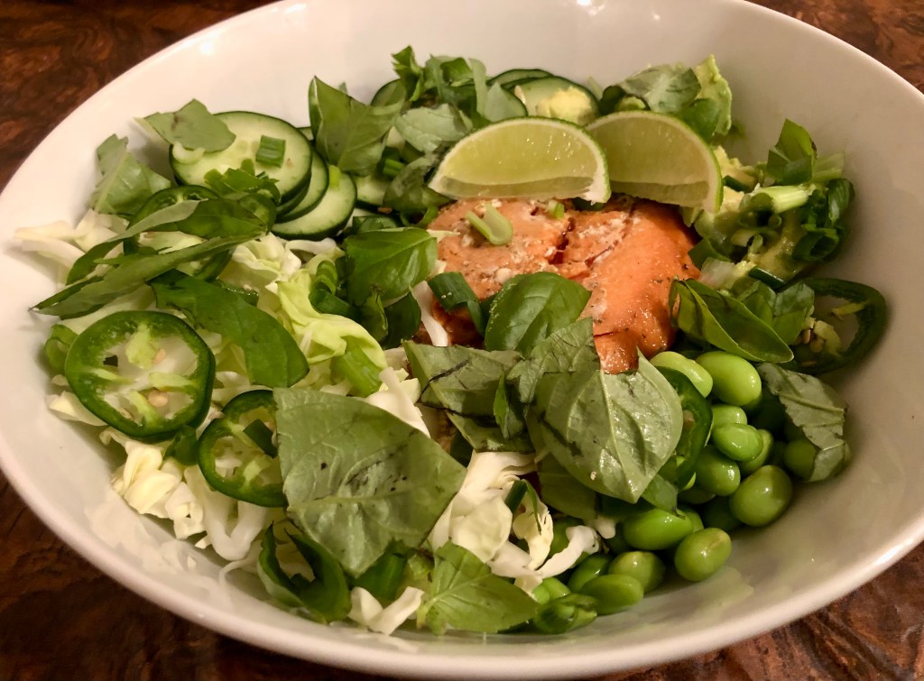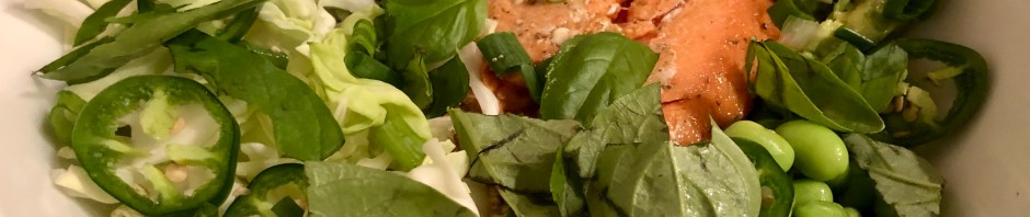 I usually have all my green vegetables cut up by the time he starts cooking. To make this mono-chromatic salad I use avocado, edamame, cabbage, cucumber, jalapeño, scallions, and either basil or cilantro. I make an almost no-oil vinaigrette from about equal parts of soy sauce and rice wine vinegar, a few drops of sesame oil, and minced garlic, ginger, and scallion. After dressing the salad with the vinaigrette I drizzle on a good olive oil. We usually eat this dish with rice or riced cauliflower.