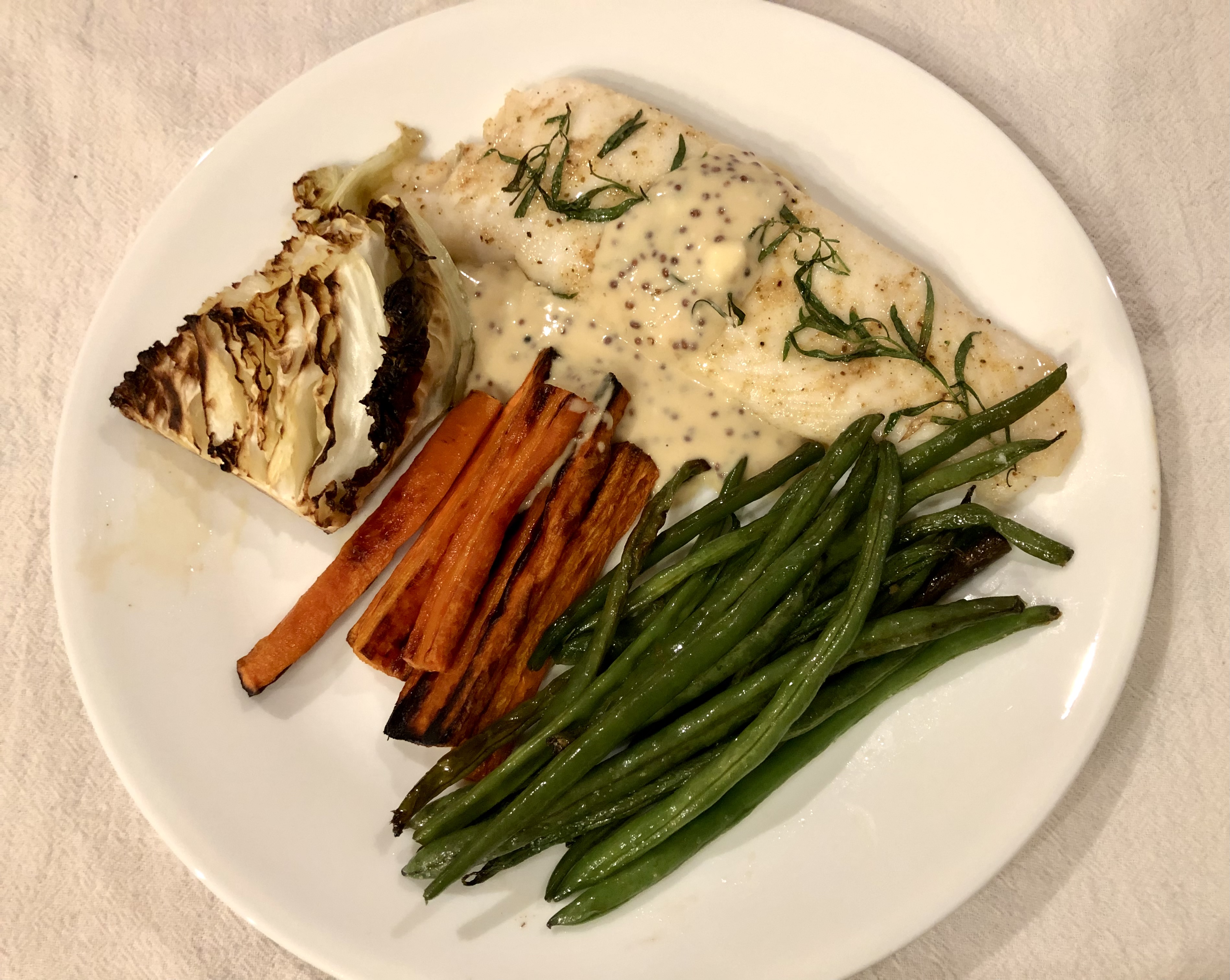 I served the fish and vegetables with a mustard sauce made up of equal parts (in this case 1 tablespoon each) of Dijon mustard, whole grain mustard, light mayonnaise, and water stirred together. Really easy, delicious, and goes well with both the fish and the vegetables.